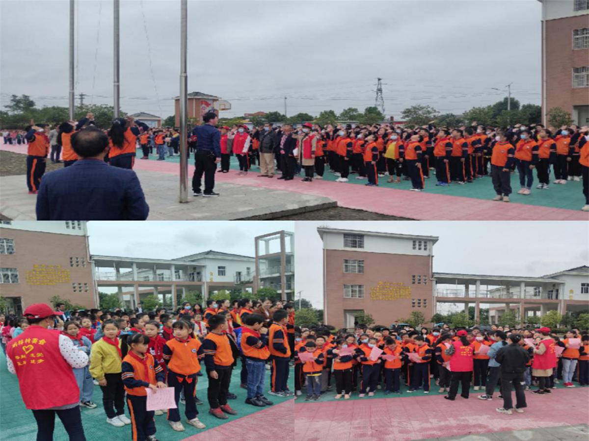 “全体立正,升国旗,奏国歌”,上午8:40,在庄严的国歌声中,国旗缓缓升起,胡林小学全校师生向国旗敬礼,激发了全体师生的爱国主义精神,引导广大青少年树立正确理想信念、人生观、价值观。胡林村党支部书记胡金辉上台向小学生宣传安全、卫生和创文等相关知识,并发放了安全、卫生、创文等主题的宣传单,教导他们要提高安全意识、爱护公共环境、不乱扔垃圾、不随地吐痰,做一名懂礼貌讲文明的小学生。随后,胡林村组织志愿者们与8名贫困学生一起交流,了解他们的学习和生活情况,鼓励他们好好学习,并送去了文具等爱心礼品。