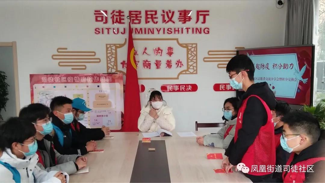 为进一步推动社区新时代文明实践站的志愿者队伍建设,充分调动志愿者和群众参与文明实践的积极性,提升文明实践获得感和幸福感,2021年2月5日下午,凤凰街道司徒社区在一楼会议室开展“益起防疫 积分助力”志愿者分享交流会暨志愿服务积分兑换会。