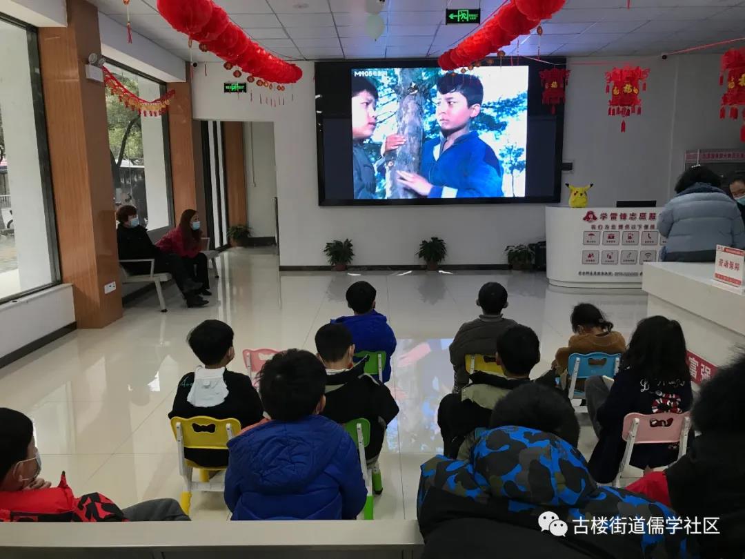 在党群服务中心大厅,社区精心挑选了红色电影《闪闪的红星》、《小兵张嘎》供孩子们观看,小朋友们看得聚精会神、津津有味,电影里的故事情节深深地吸引住了他们,高潮之处孩子们会不由自主的欢呼起来。