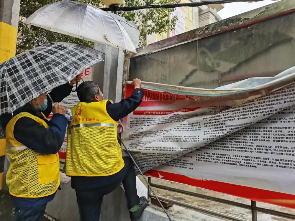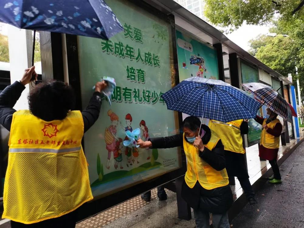 毛毛细雨中,20余名银发志愿者一手打伞,一手拿着抹布,兵分两路对凤凰路和东塔路沿线及凤凰小区内的的公益广告牌、宣传栏进行擦洗。虽然细雨蒙蒙,但是志愿者们个个干劲十足,就着雨水认真仔细地擦拭沾满灰尘的广告宣传牌,同时对破损广告牌进行维护和修整。