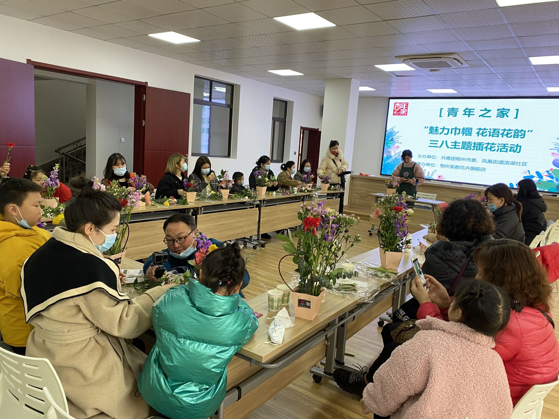 在三八女神节来临之际,为了体现社区对女同胞的特别关爱,同时丰富青少年的业余文化活动,服务青少年成长发展需求,3月6日下午,滨湖社区联合共青团鄂州市委、鄂州青少年事务服务中心、鄂州吴都花卉开展“魅力巾帼 花语花韵”亲子插花活动。