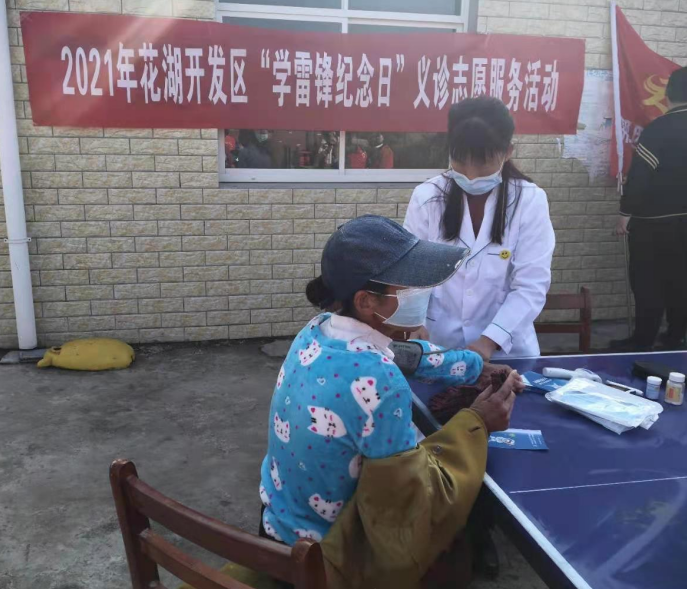 志愿者队伍中的卫生院医生在学雷锋日的活动旗帜下,开展义诊活动,关心八庙村民的身体健康,并为村民的日常保健给予建议。