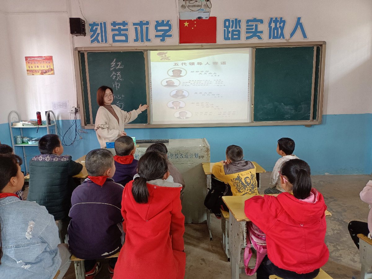 “同学们,祖国的春天是革命前辈用鲜血浇灌的,是他们用生命换取的,是他们用灵魂铸成的。”秦清老师带领队员们了解了建国以来的五代领导人。