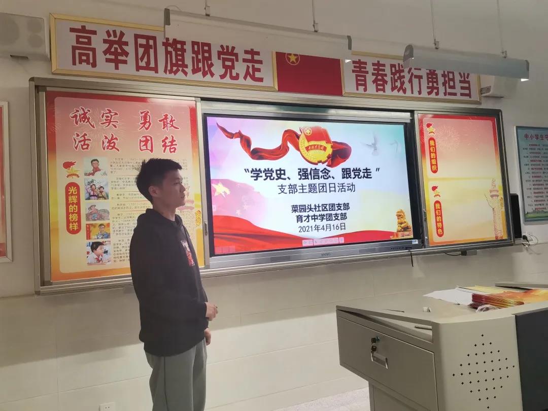 深入学习贯彻习近平总书记在党史学习教育动员大会上的重要讲话精神,教育引导广大团员青年了解党的光辉历史、感悟党的初心使命、领会党的创新理论、传承党的红色基因,2021年4月16日下午4点,菜园头社区团支部联合育才中学召开“学党史、强信念、跟党走”4月主题团日活动。