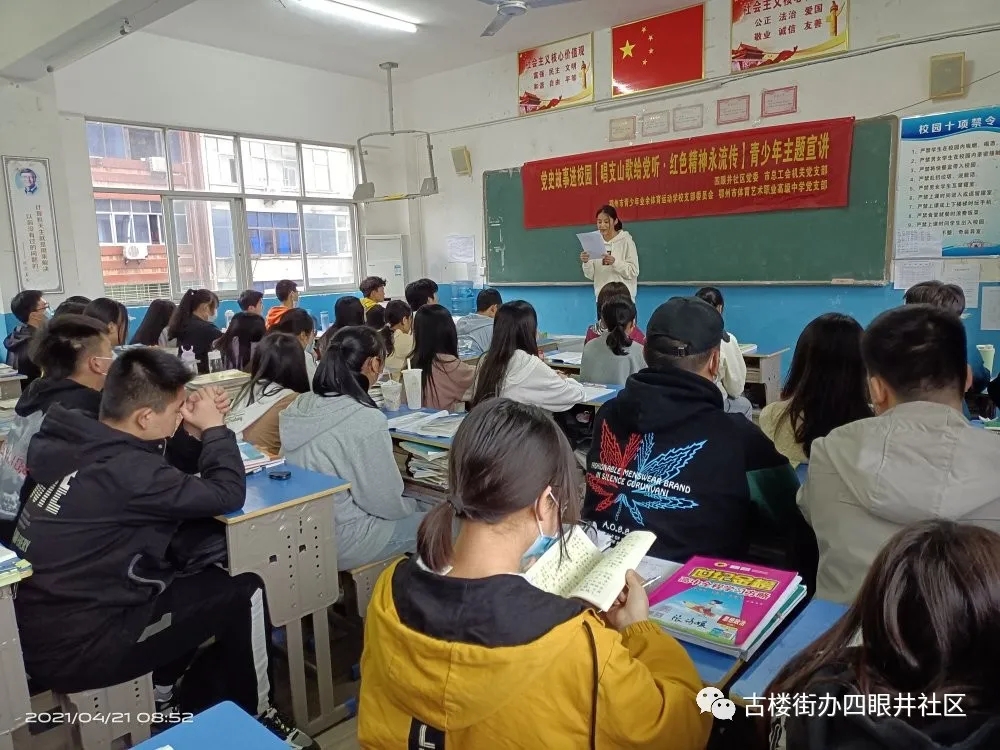 4月21日上午四眼井社区党史教育学习分场进入市体育艺术职业高级中学推动党史学习进校园。一场红色宣讲在青少年心中扎下了根。