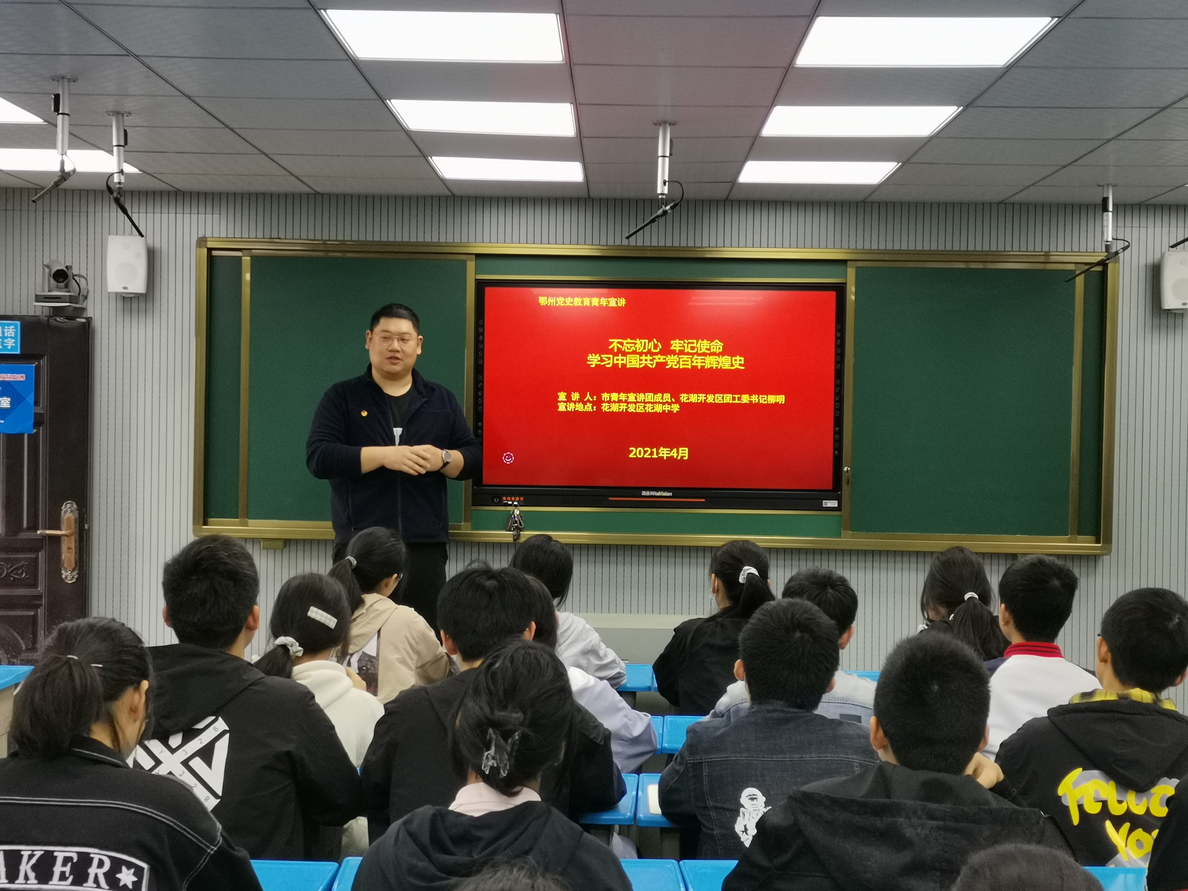 为迎接中国共产党百年华诞,培育社会主义的合格建设者和接班人。4月25日,鄂州市青年宣讲团成员、花湖开发区团工委书记柳明同志应邀来到花湖中学为学生们开展党史教育宣讲团课。