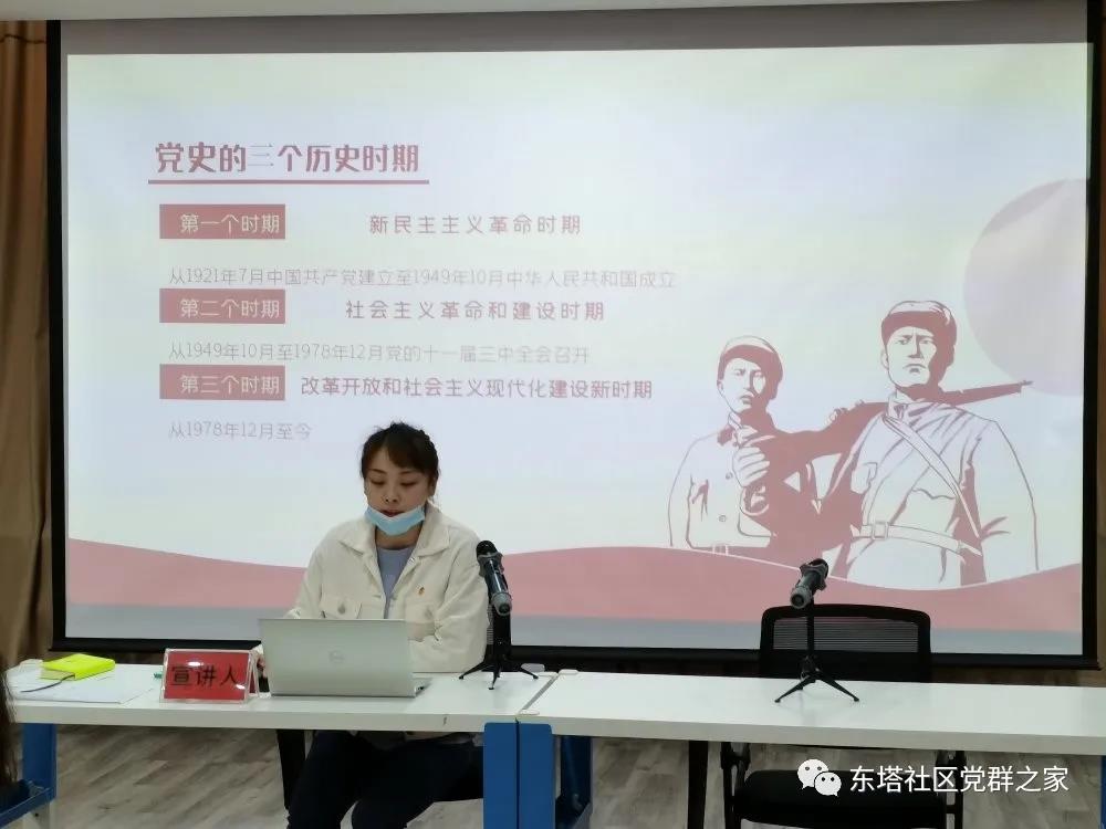 台上,张嘉颖从全面了解中国共产党百年奋斗的光辉历程和历史性贡献入手,围绕“党的三个历史时期(即:新民主主义革命时期、社会主义革命和建设时期、改革开放和社会主义现代化建设新时期)”,以及中国共产党百年历史总结等方面为现场党员、团员做了一场深入浅出的宣讲。