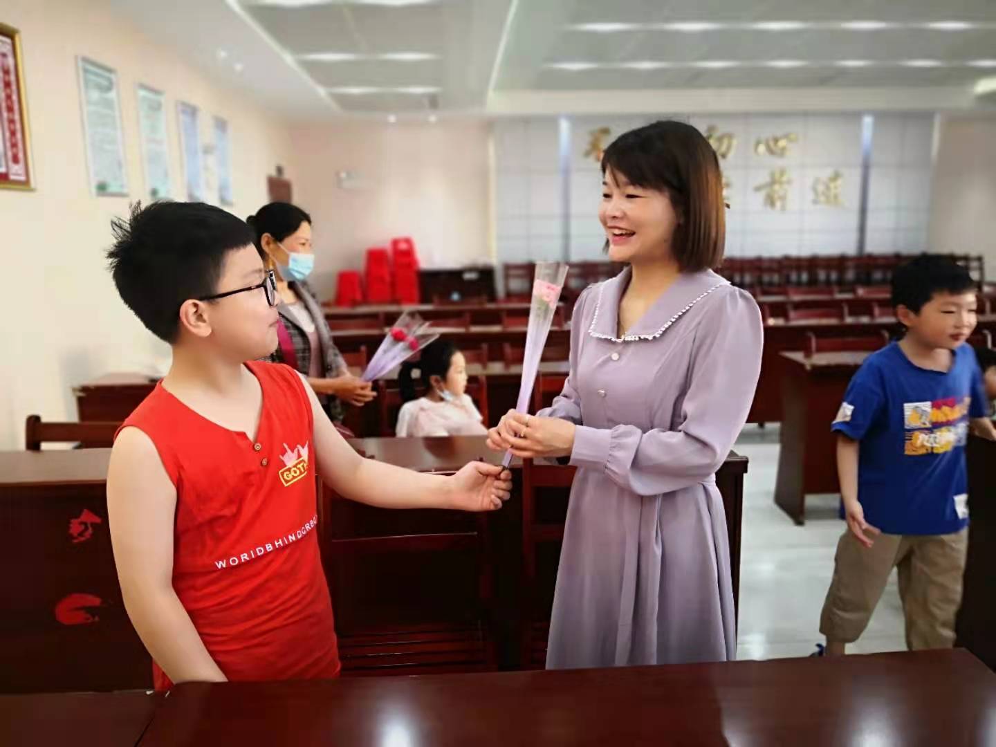 随后志愿者老师给孩子们分发代表爱的康乃馨,并把花献给妈妈,在志愿者老师的引导下,孩子们带着饱满的爱对妈妈说出:“妈妈,我爱你”,现场的妈妈们热泪盈眶,感动不已。
