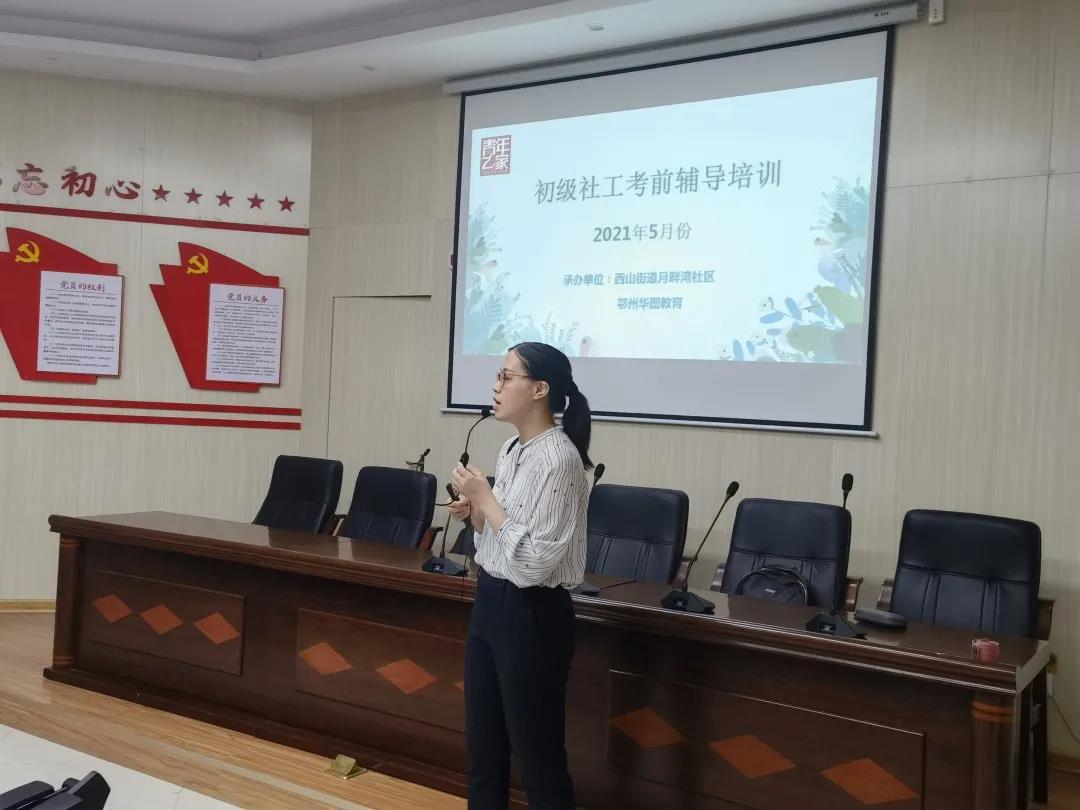 为进一步提高社区社工人才队伍的专业化水平,不断优化和提升社工人才队伍结构,为社区建设提供强有力的人才支撑。5月14日,共青团鄂州市委、鄂州市华图教育、月畔湾社区联合开展初级社工考前辅导培训,组织了各社区备考的人员参与培训,帮助应试人员梳理考试内容、领会考试要点、提高考试通过率。