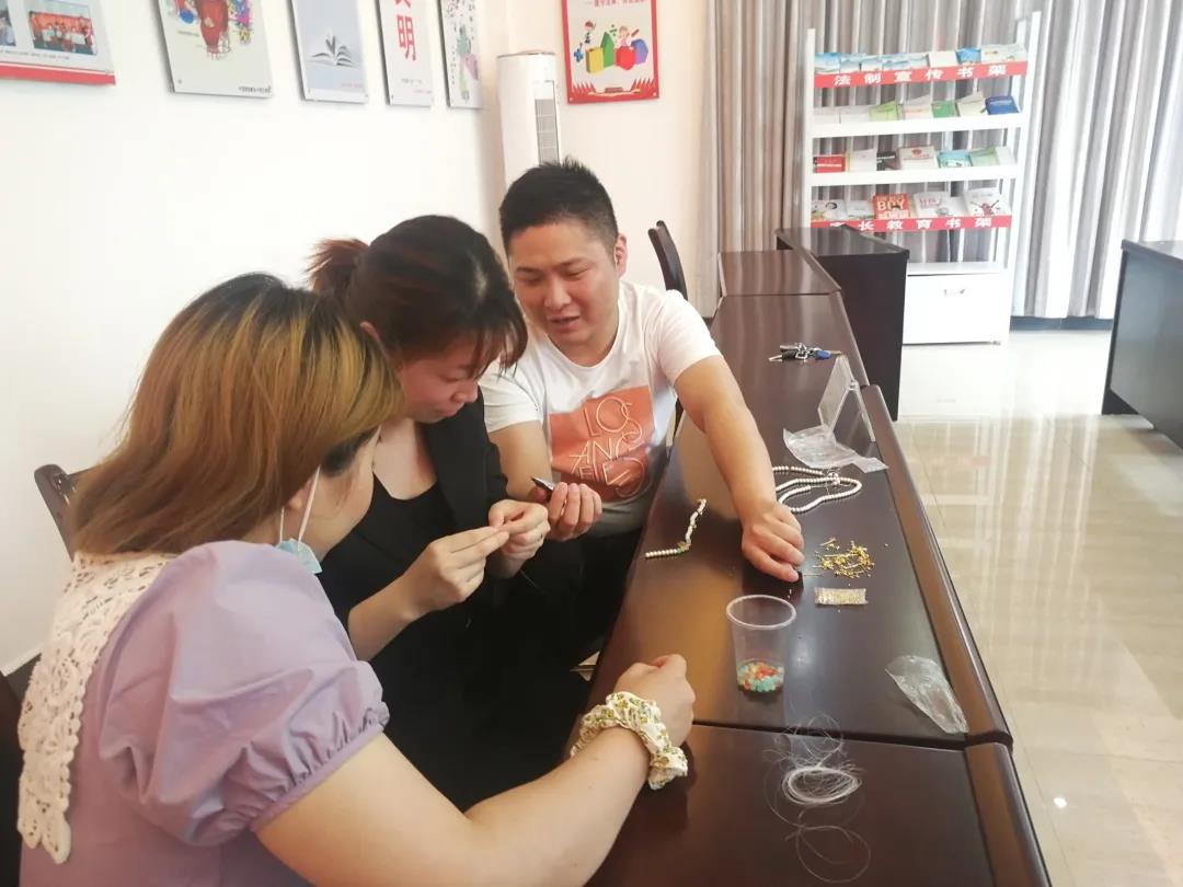 在制作璎珞的过程中,有些对手工diy制作不不太熟练的居民,遇到了一些难点问题,但在老师、工作人员及其他参加者的指导和帮助下,解决困难,一个个普通的珠子、配件通过大家手工加工,拼凑出各式各样的漂亮作品。