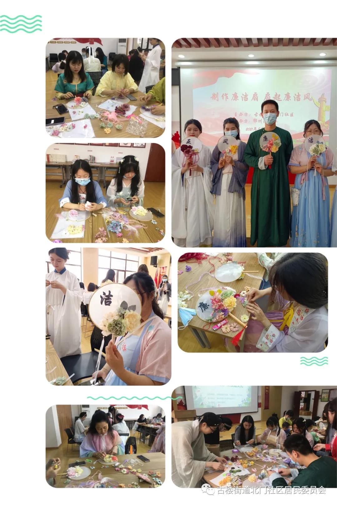 李老师为大家准备了空白扇子、花瓣、热能胶等各种小配件,并向大家讲解手工团扇的制作方法、注意事项,在老师的指导下,青年朋友们纷纷拿起工具,在互相交流讨论的热烈氛围中,发挥丰富的想象力和创作力,运用生动的花卉、书法等艺术形式,把廉洁文化与中国传统扇古风文化完美融合于一张小小的扇面之上,青年朋友们都感到十分欣喜。本次活动,共制作古风廉洁扇作品33幅,大家开心的将自己特殊的古风扇带回家,社区内保留一幅正、风、廉、洁古风扇作品作为文化宣传。活动结束后,大家满怀欢喜地展示自己的作品,互相拍照留念,灿烂的笑脸与扇面上的花朵交相辉映。