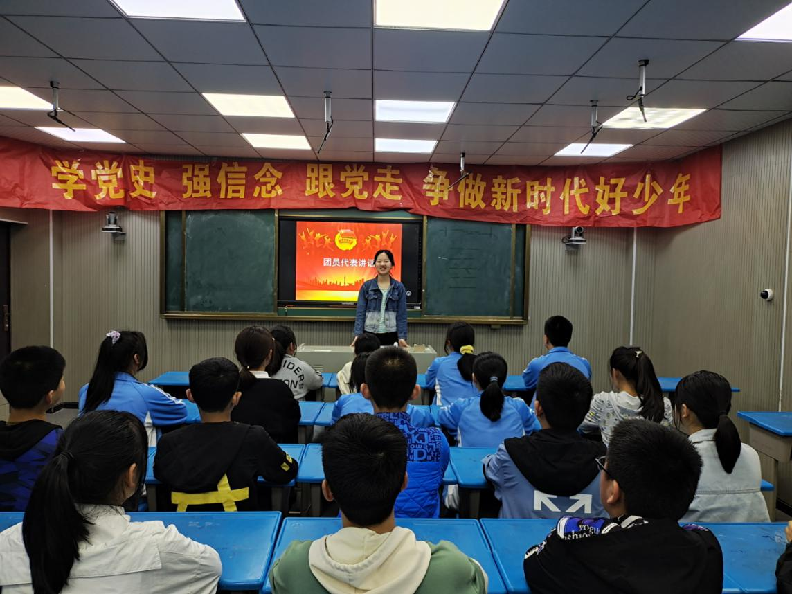 进行到团员代表讲话时,团员们都非常活跃。团员潘懿婵说道:前行不忘来时路,初心不改梦归处!今天,我们回顾历史,不仅是缅怀党的光辉业绩,更重要的是在学习党史中,坚定理想信念,端正人生追求。范理渠同学则说道:我们当代中学生正是承前启后,继往开来的一代,是背负“中国梦”圆的一代。正如鲁迅先生所言“无穷的远方,无数的人们,都与我有关”。今日心怀天下者并非一人,我们少年虽身居学堂却心系国家,摩拳擦掌准备为国效力,坚守初心,勇担责任,争做国家栋梁。刘梦瑶同学说:今天,作为新时代的青年,在实现中国梦的道路上我们应当牢记:唯有今日的坚守初心,才能助力我们的青春梦!
