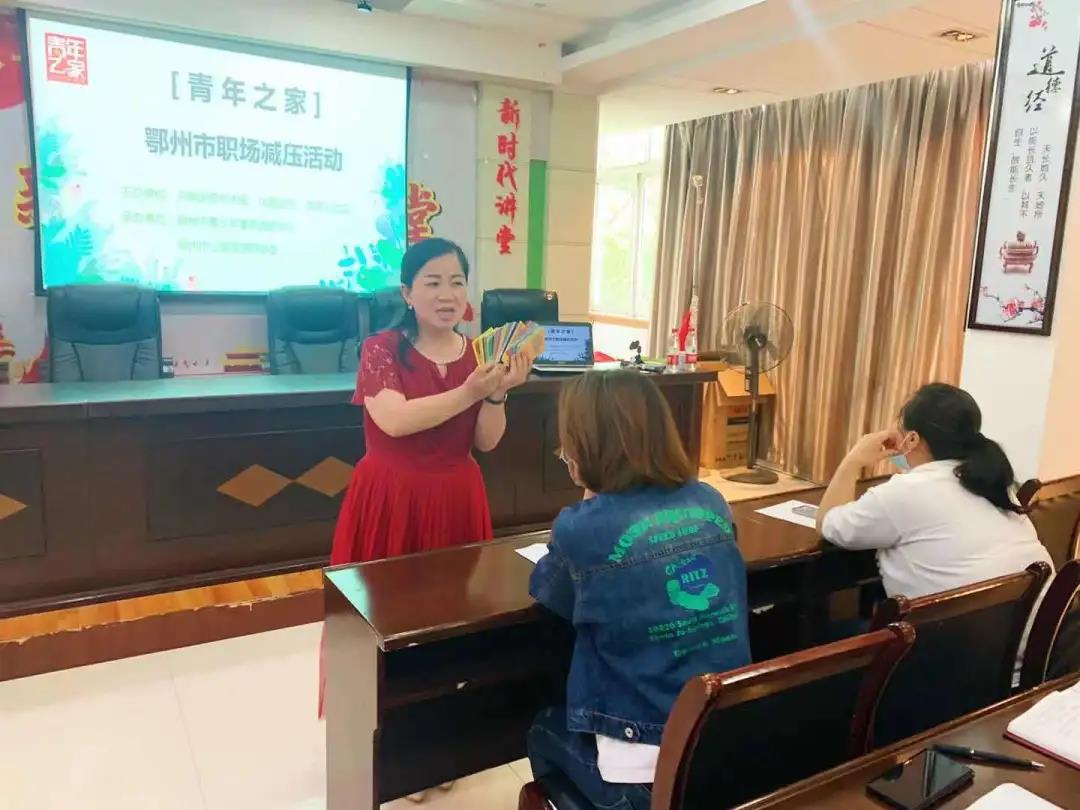 为丰富鄂州市青年群体精神文化生活,搭建交流平台,服务青年成长发展需求。2021年5月28日,共青团鄂州市委联合莲花山社区、鄂州市青少年事务服务中心、 鄂州市心理咨询师协会开展——青年之家鄂州市青年职场减压活动。