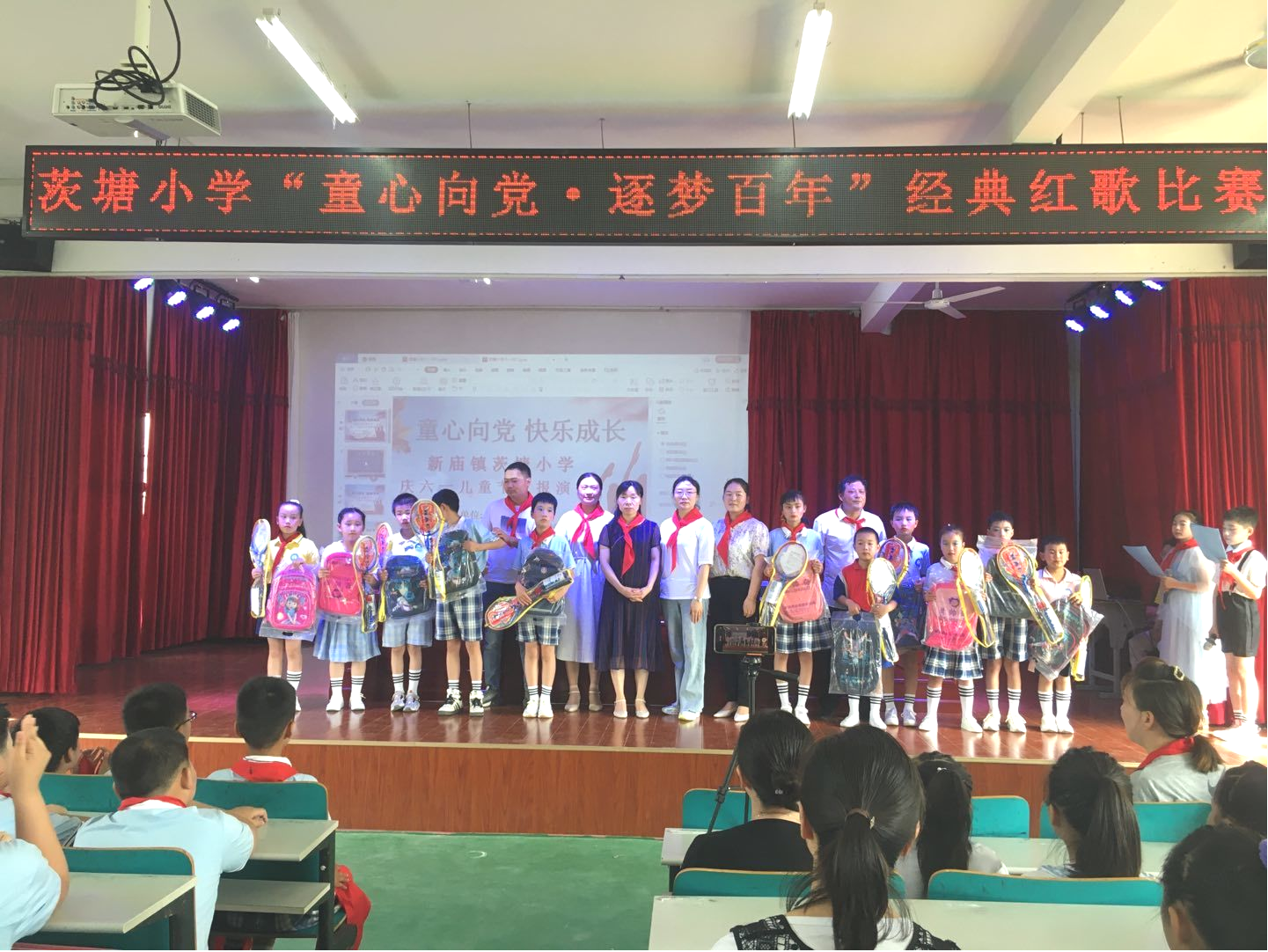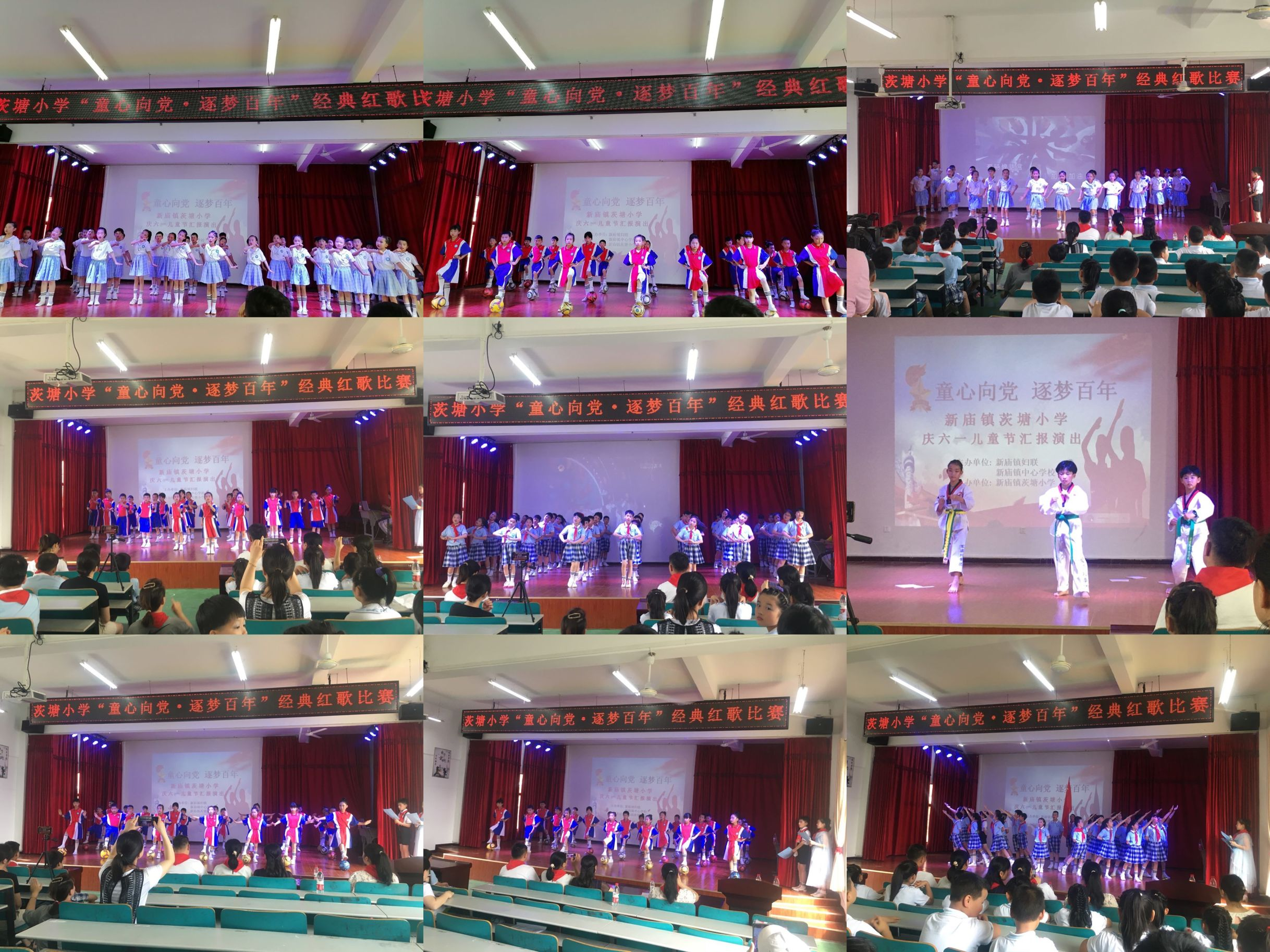火红的六月,放飞梦想的风采,为庆祝六一国际儿童节,2021年5月31日上午,新庙镇茨塘小学全体师生在该校阶梯教室集会,用自编自演的节目举行了一场"童心向党,逐梦百年"文艺汇演活动。汇演的内容丰富多彩,有歌曲, 舞蹈,小品,朗诵、跆拳道表演等18个节目。