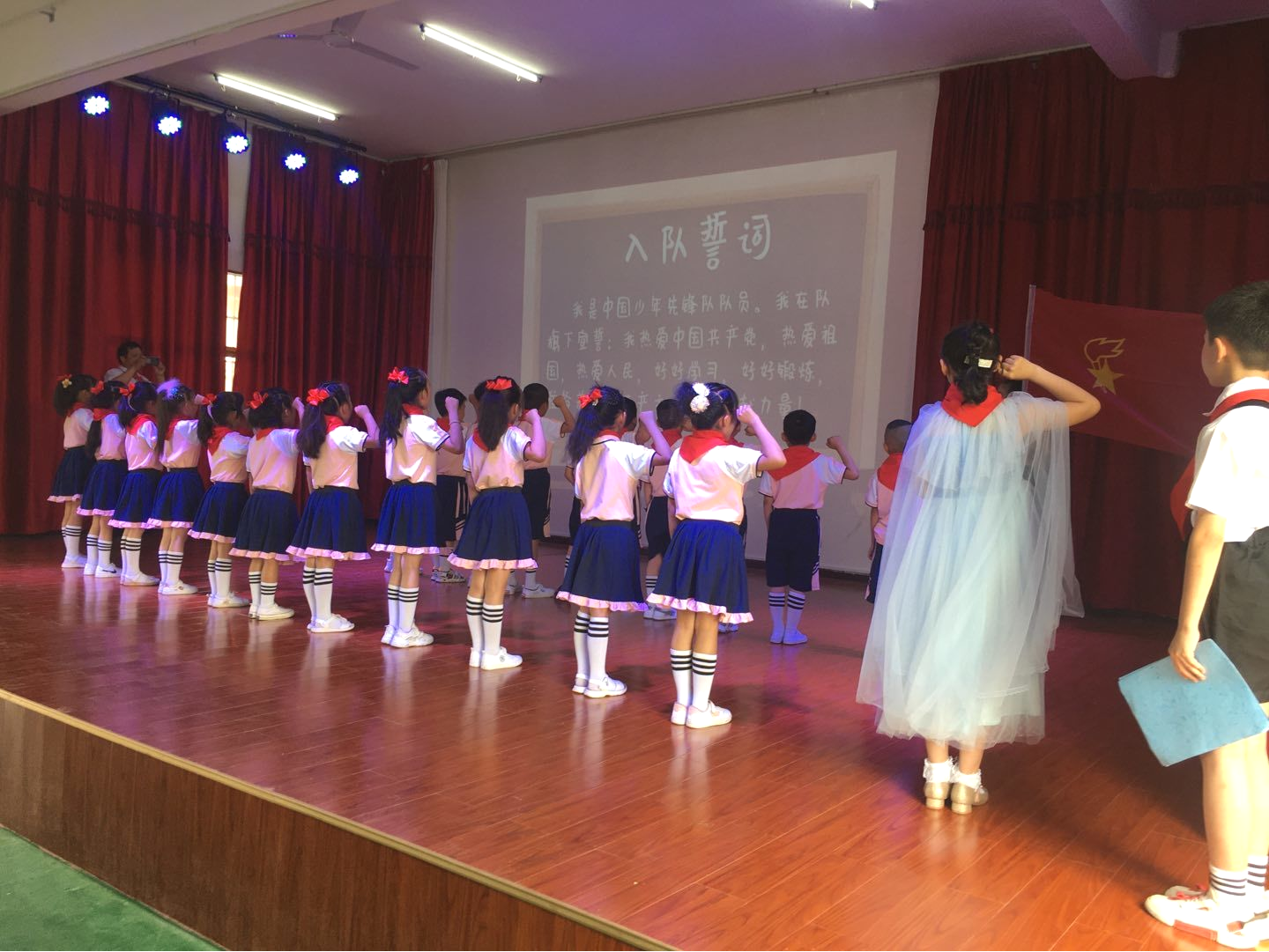 紧接着举行了庄严的少先队入队仪式!又一批新的雏鹰加入了少先队这个大家庭,戴上红领巾的新队员们各个心情澎湃,神采奕奕,有种自豪感。