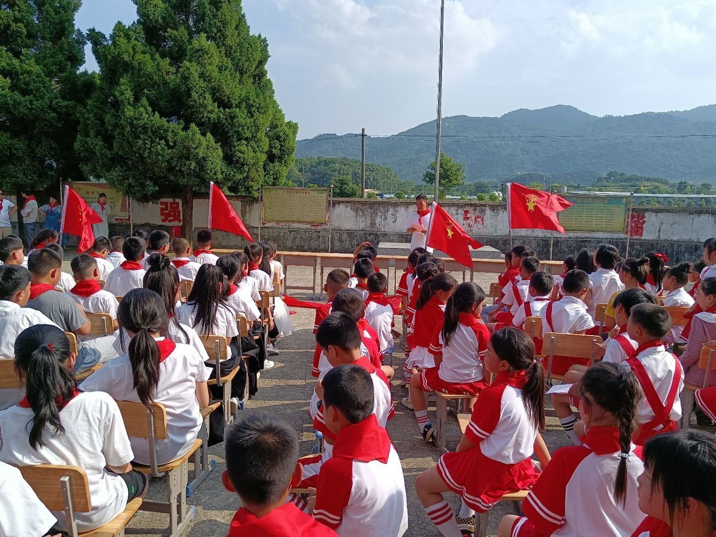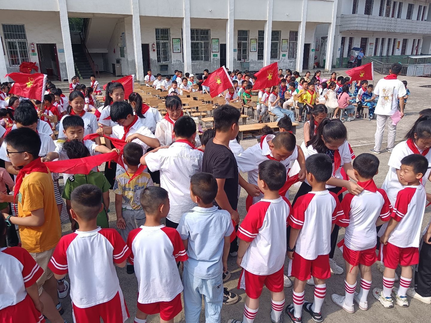 老队员代表迈着整齐的步伐走到新队员队伍中,郑重地为新队员系上鲜艳的红领巾