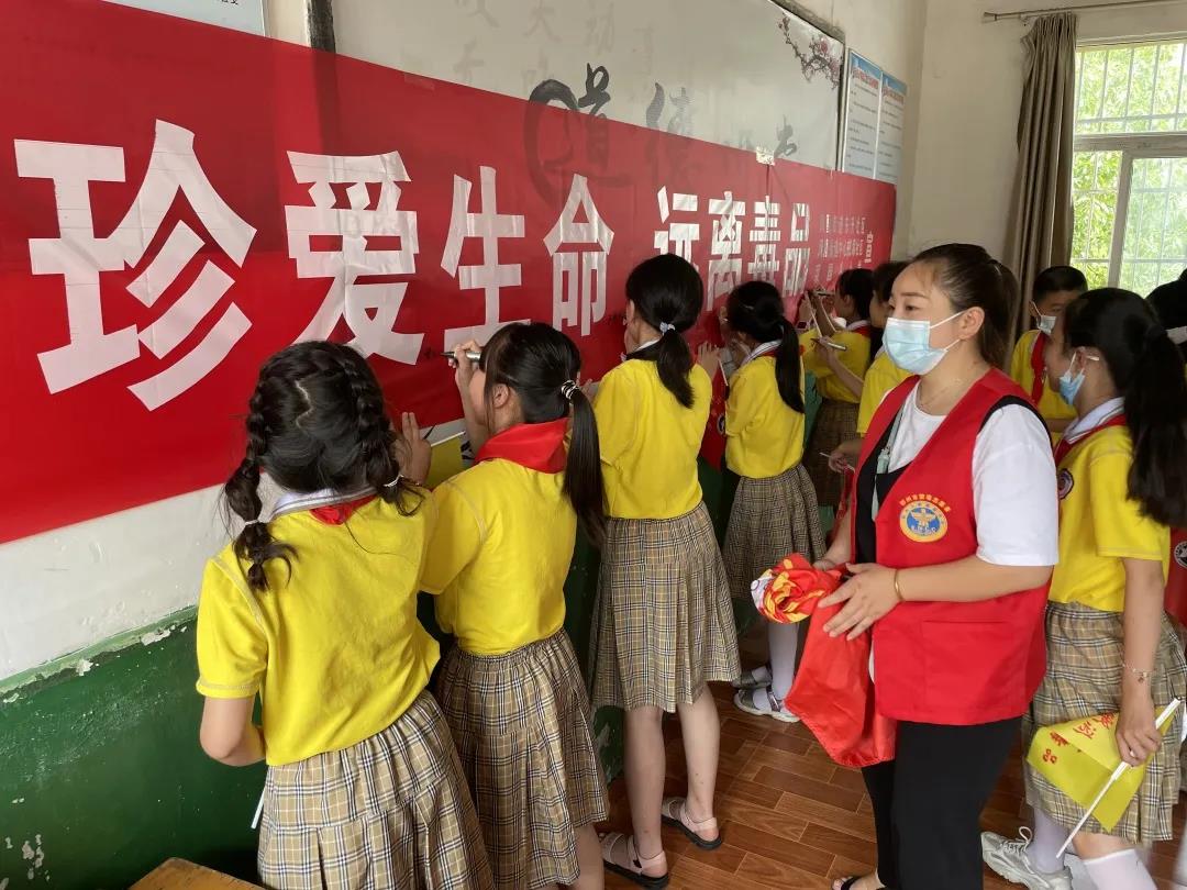 活动结束,全体师生纷纷手持手挥禁毒标识小红旗在禁毒拒毒承诺横幅上签名并齐声呐喊出“珍爱生命,远离毒品,从我做起”的禁毒口号合影留念。