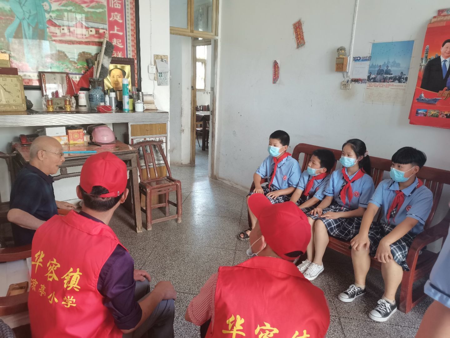 为庆祝建党一百周年,进一步增强党员干部的使命感。6月23日,顶着炎炎烈日,凉亭小学党支部组织党员带和少先队员一行来到凉亭社区走访慰问了老党员廖传炎,并送上慰问品。廖传炎是凉亭村老书记,廖书记已有五十多年的党龄,他为人和善,平日里热心帮助群众排忧解难,得到群众的一致好评。学校副校长吕建军和工会主席周其新两位同志亲切地与老人家进行交谈,详细询问老党员的生活和身体健康以及子女工作情况,希望他能保重身体,继续发挥党员带头作用,发挥余热为乡村发展贡献力量。队员们帮老人打扫完卫生后坐下来与老人聊天说:“爷爷,我们就是想听听您入党的故事。”听着孩子们稚嫩的声音、真诚的话语,老党员的眼角不禁泛起了泪花,开始跟孩子们重温了他老人家的先进光荣事迹,告诉孩子们要心怀感恩、努力学习、刻苦锻炼、健康成长。队员们谨记廖爷爷的嘱托,纷纷表示要不负期望,将来用自己的智慧和无限的创造力来建设伟大的祖国。