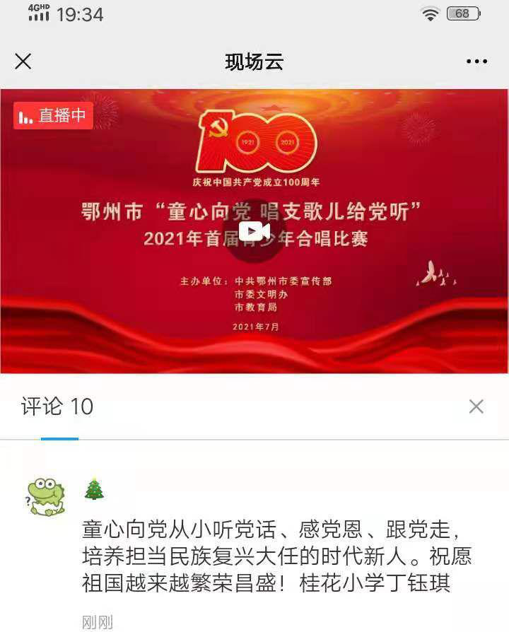 漫漫征途忆峥嵘岁月,声声嘹亮颂百年初心。2021年7月13日(星期二晚上)19:00,市委文明办、市教育局在凤凰广场下沉式喷泉广场中心举办2021年童心向党鄂州市首届青少年合唱比赛活动。桂花小学组织全体师生在家利用网络直播平台准时观看,第一时间为精彩的表演点赞,并留言。