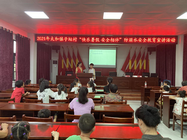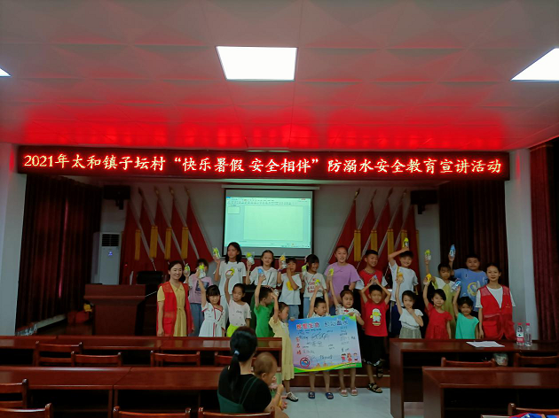 “池塘边有很多危险,小朋友们要离它远一点……”轻快的旋律在子坛村村委会二楼会议室响起。正值暑假到来之际,7月17日上午,太和镇团委联合子坛村开展“快乐暑假 安全相伴”防溺水安全教育宣讲活动。