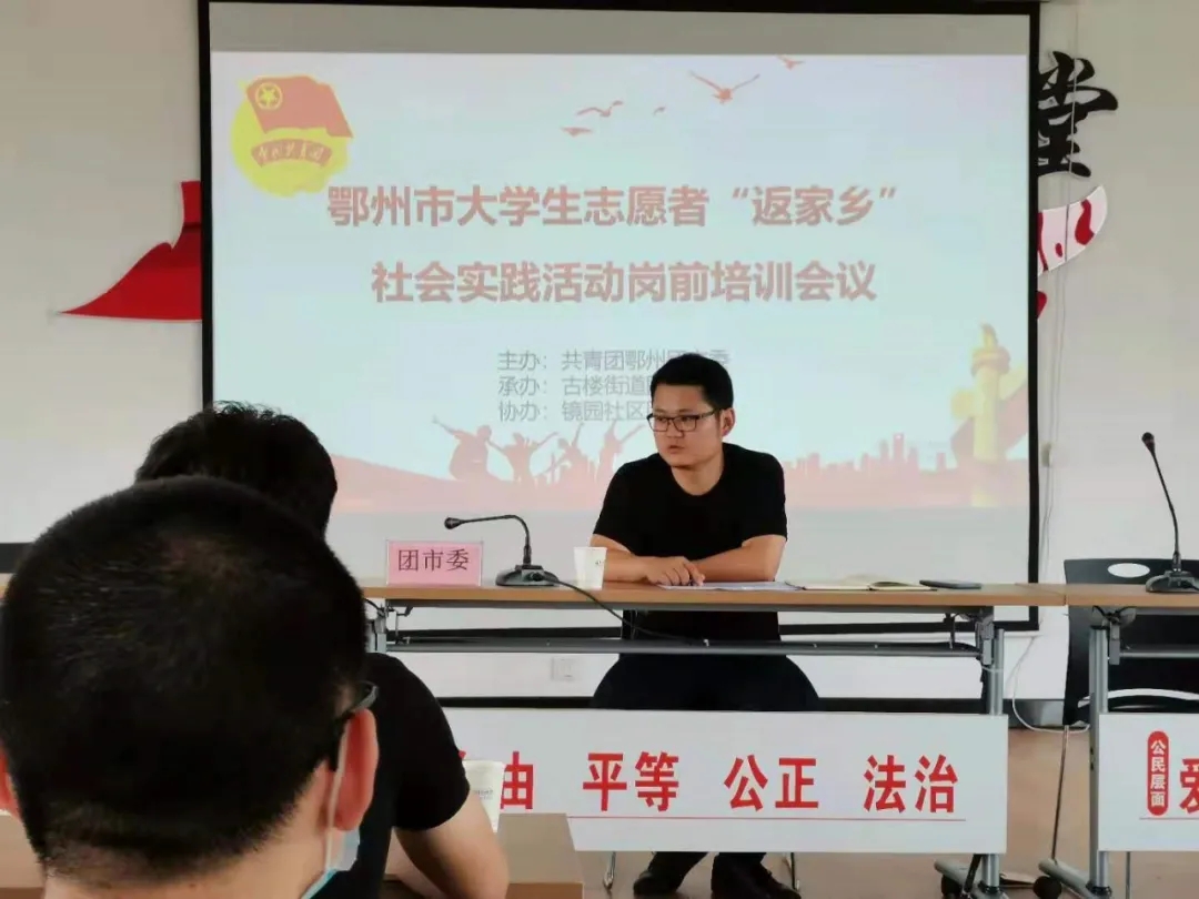 为认真贯彻落实习近平总书记关于青年工作的重要思想,组织大学生助力基层社会治理、积极投身乡村振兴战略,使更多优秀大学生利用假期时间在全市新时代文明实践志愿服务中受教育、长才干、作贡献,7月26号,团市委在古楼街道镜园社区组织召开岗前培训会,鄂城区各街道团工委书记、大学生志愿者,承接志愿者的社区(村)团支部负责人共30余人参加此次会议。