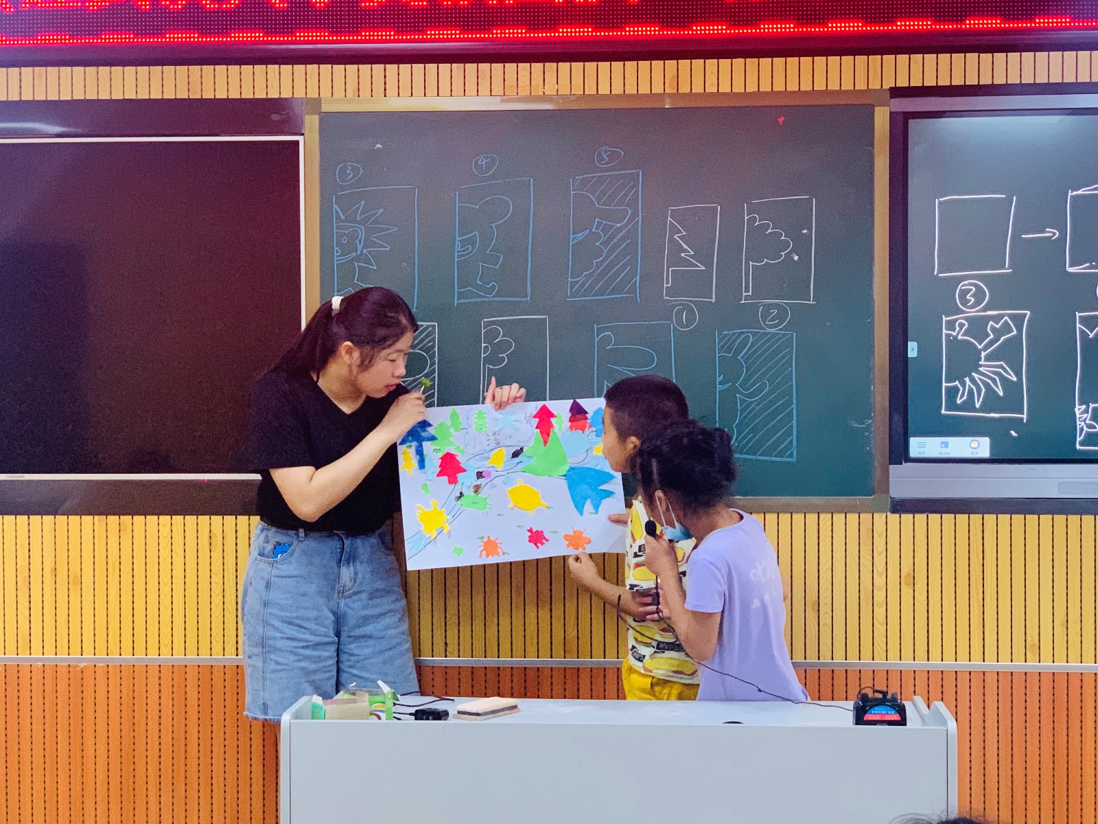 第一节课是手工课。程睿老师首先给同学们介绍了一些常见的植物和动物的剪法,接着志愿者们和同学们一起以小溪、花园、草原为主题完成了三幅拼贴画。小朋友们从画画到剪纸和拼贴都自己动手完成,成就感满满。