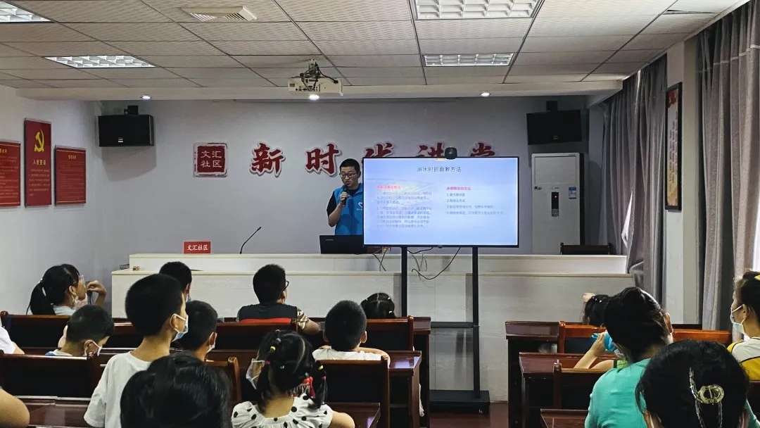 讲座现场,文汇社区青年志愿者结合理论知识、实际案例、动画视频、互动提问的方式,重点讲解了防溺水、防高温中暑、防雷电、饮食安全、用电安全、网络安全、消防安全等方面的知识。文汇社区志愿者就防溺水做出细致的讲解,指出防溺水的措施和溺水时的救助方法,结合新闻热点强调预防溺水的重要性。随后又讲解防中暑和雷电的技能和生活安全的知识,掌握自我保护和防范的本领,时刻提醒自己把安全放在第一位。