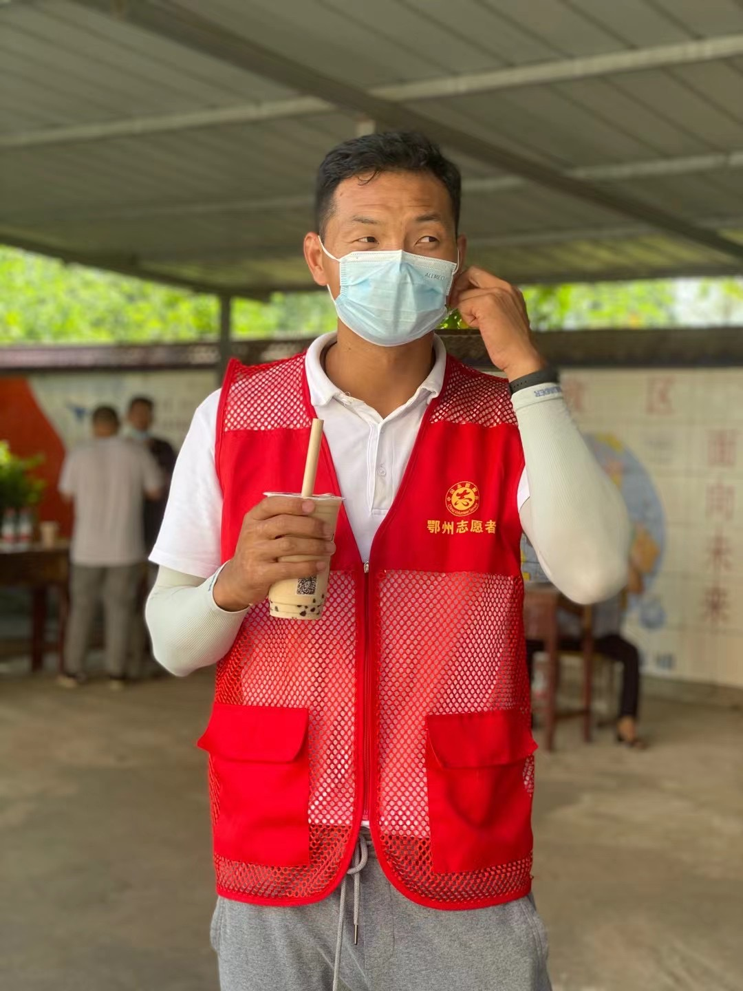 图为政府机关团支部闵佳明同志在东港社区进行人员分流引导工作后,村民热情送上秋天的第一杯奶茶。