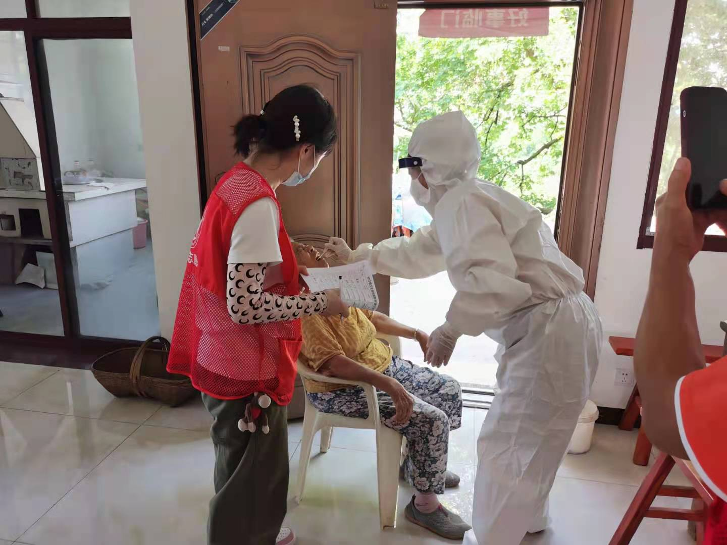 图为7日中午,下王村青年志愿者与医护人员上门为行动不便人员核酸采样,确保下王村核酸检测不落一户、不漏一人