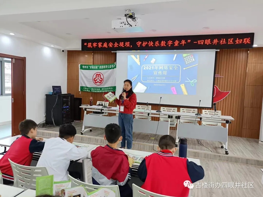 为增强未成年人的网络防沉迷知识,提升自护意识和能力,推动在家庭中形成文明、健康上网的良好网络素养,筑牢家庭安全堤坝。2021年10月11日,由鄂城区妇联主办,古楼街道四眼井社区妇联承办的未成年人网络安全教育专题宣传讲座走进四眼井社区,本期讲座以“筑牢家庭安全堤坝,守护快乐数字童年”为主题,活动邀请辖区家长、未成年代表50余人参加。