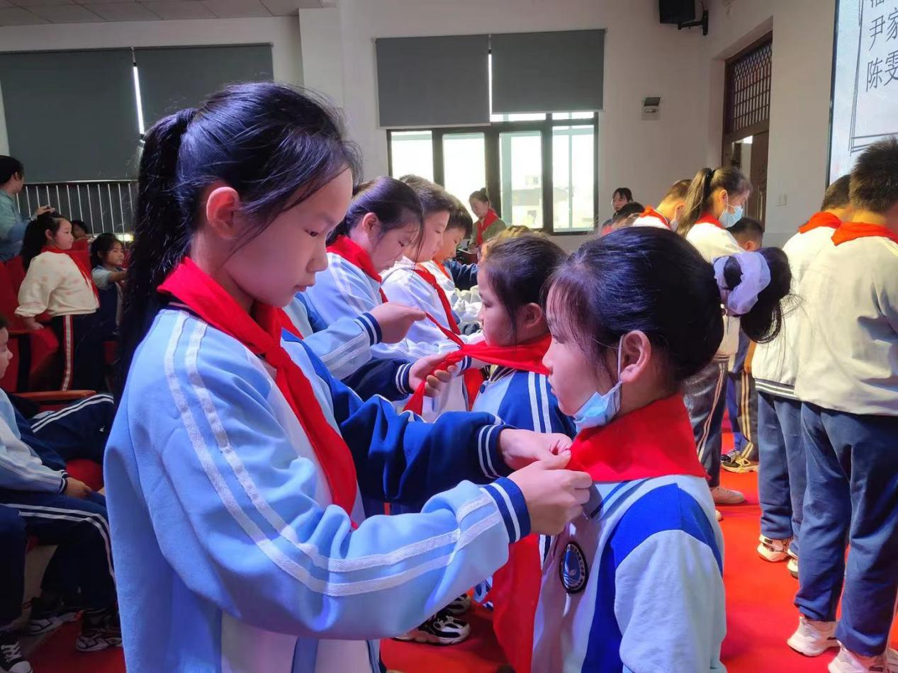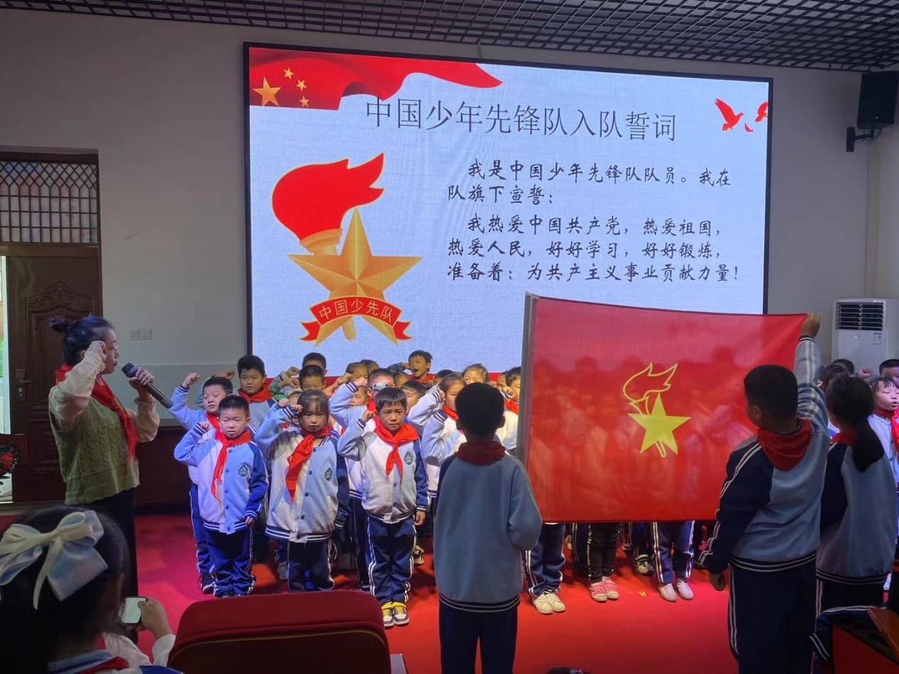 仪式上,六年级中队的大哥哥、大姐姐为新入队的弟弟、妹妹们佩戴了红领巾。当新老队员互敬队礼时,整个画面定格了!是啊!红领巾是光荣的象征,戴上红领巾,就多一份责任,就要为它增光添彩。在大队辅导员的带领下,新队员在鲜艳的队旗下庄严宣誓。