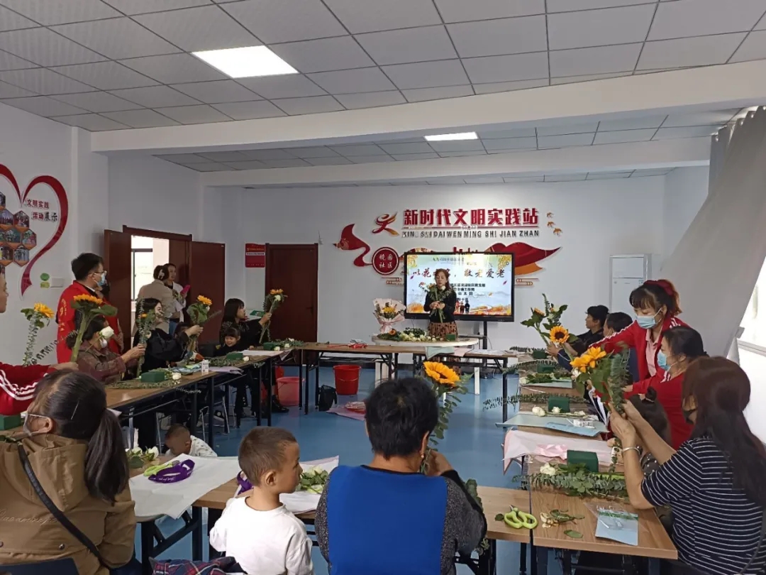 又是一年重阳到,为弘扬中华民族尊老、爱老、助老的传统美德,丰富老年人的退休生活,扩宽老年人的交友圈子,在农历九月初九我国传统节日——重阳节即将来临之际,镜园社区大团委联合市地方金融工作局、海卫幼儿园开展“以花之名,敬老爱老”为主题的重阳节插花活动。