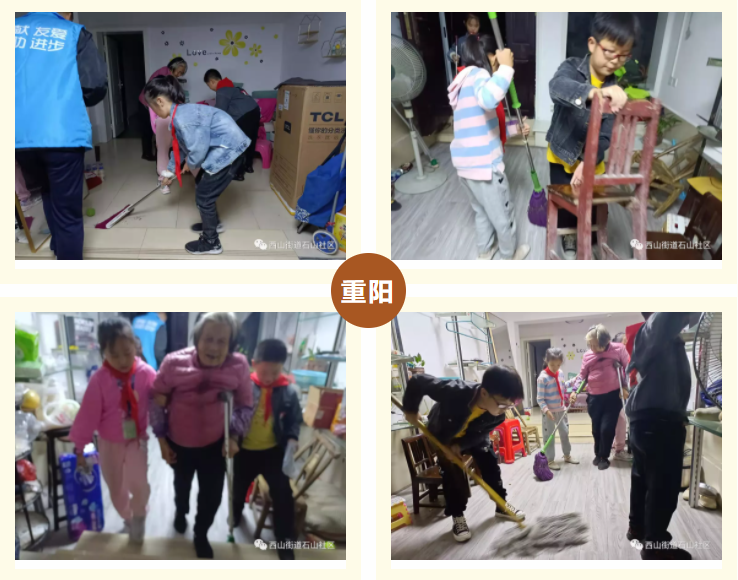 “金秋十月,丹桂飘香”,值此重阳节到来之际,为更好地传承中华民族的传统美德,营造爱老、敬老、尊老、助老的良好氛围。石山社区观澜花园的小小志愿者们走进小区,帮助老人们打扫卫生,与老人们欢聚一堂,使老人们深切感受到家的温暖,度过了一个温馨又难忘的九九重阳节。