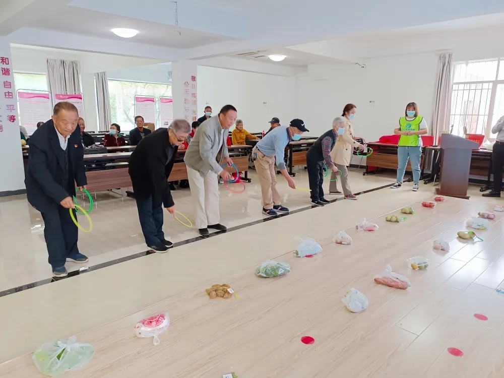 欢声笑语,游戏环节;在志愿者的悉心指导下,老年朋友们积极参与游戏互动,将自己手上的项圈圈上自己心仪的水果、蔬菜等生活用品的小礼品。