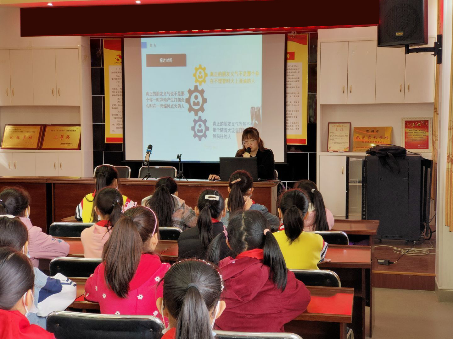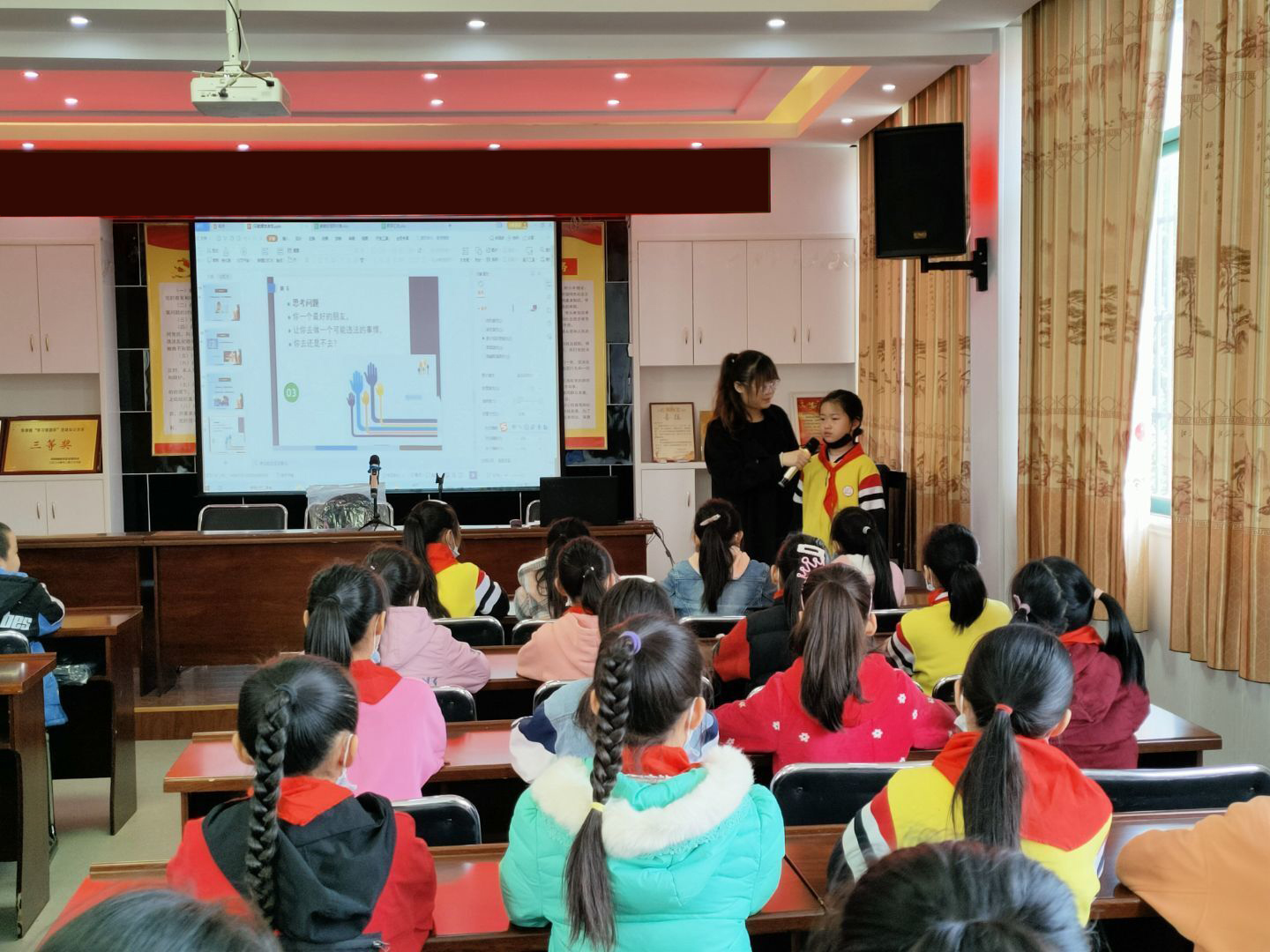 姜法官提示同学们:遭遇暴力伤害,不要独自一人承受恐惧和痛苦,更不能以暴制暴,要及时告诉家长和老师,必要时拿起法律的武器,维护自身的正当权益。在讲座中,她还教育同学们要学会远离犯罪,要谨慎交友,不能乱用“义气”,同学们之间要和平相处,不能拉帮结派,不能搞小团体主义,不能以众欺寡、以大欺小、以强欺弱,要增强防范意识,保持必要的警惕性,掌握一些自救本领,一旦遇到危险首先要保护好自身安全。在讲座中还实际列举了一些违法犯罪的现象和事实,给在座的每位同学都敲响了警钟。浅显易懂的语言、生动鲜活的事例,同学们全神贯注,认真聆听。在知识竞赛环节,学生