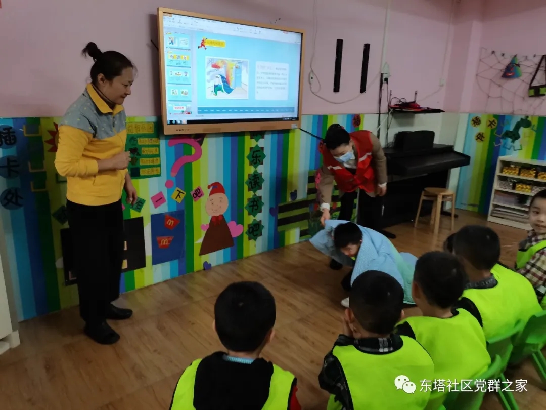演练开始之前,东塔社区网格员和幼儿园老师通过视频、ppt、图片等方式,用最浅显易懂的语言从消防基础知识、认识消防设施、如何预防火灾、火场逃生方法等方面为小朋友们讲解消防安全知识。