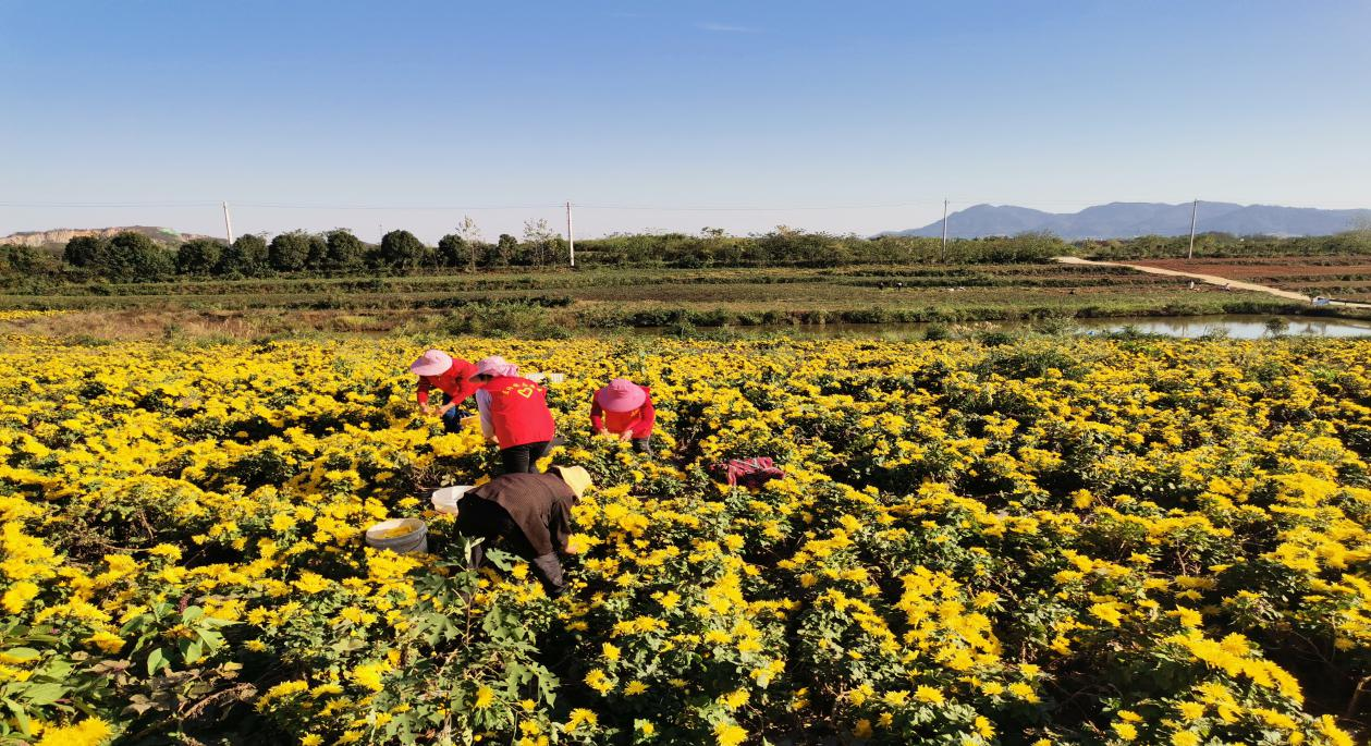 十一月小阳春、东沟镇龙塘村种植的金丝皇菊进入收获期,一片片金黄色的金丝皇菊开的正艳,村民们穿梭在花海中采摘菊花。一簇簇、一丛丛,花朵硕大,傲然挺立在阳光的照耀霞,熠熠生辉和远处的风景构成了一幅优美的画。利用晴好天气,志愿者们走进种植基地帮忙加紧采摘、搬运、分拣、烘干、包装菊花供应市场。