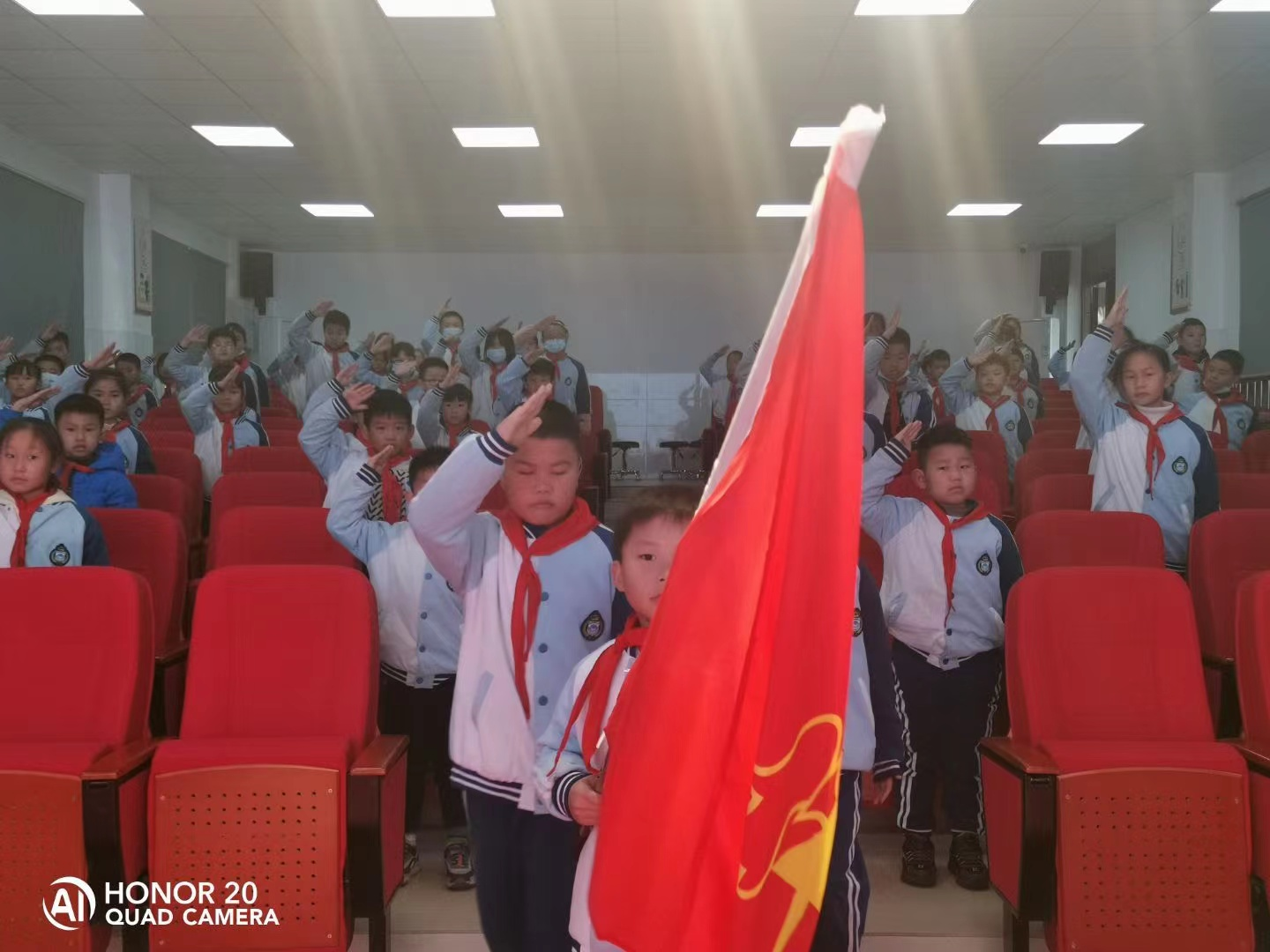伴随着少先队队歌的音乐,旗手彭帅同学手持少先队大队旗缓缓地进入会场。全体参会人员起立,少先队员行队礼。随后,少先队员们齐唱《我们是共产主义接班人》。