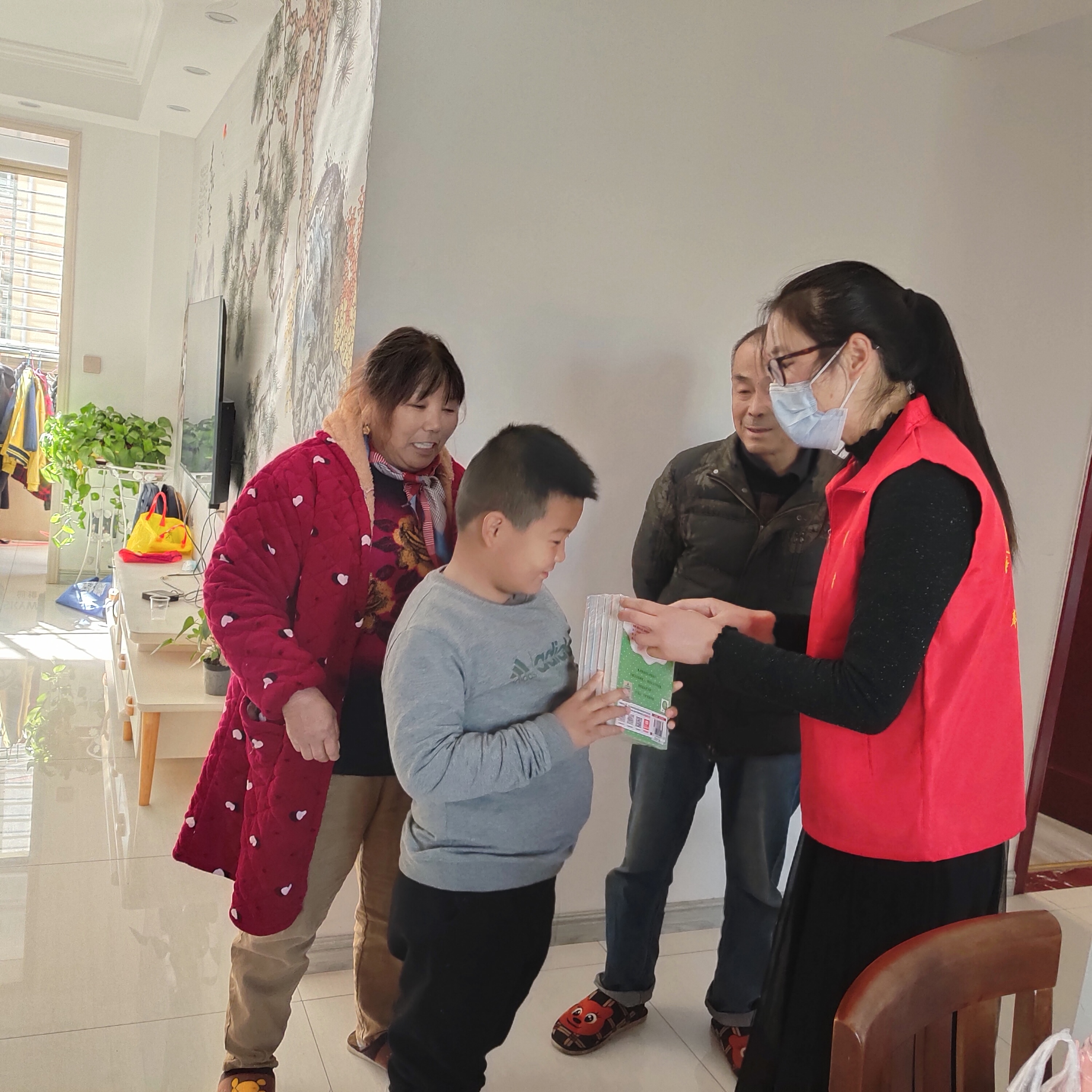 从早上九点到下午三点半,新区团委负责人李玉娟带领各村团委书记对五村一社区的10名事实无人抚养或身体有残疾的儿童、13名留守儿童进行走访慰问,为他们送上10件羽绒服,13套励志类书籍,向他们送去寒冬里的问候和祝福。每到一户,各位团委世界都亲切询问孩子们的生活情况和学习情况,并叮嘱他们有什么困难和问题可随时找我们,这些青少年儿童穿着崭新的棉袄,捧着励志类的书籍,每个人的脸上都笑开了花。