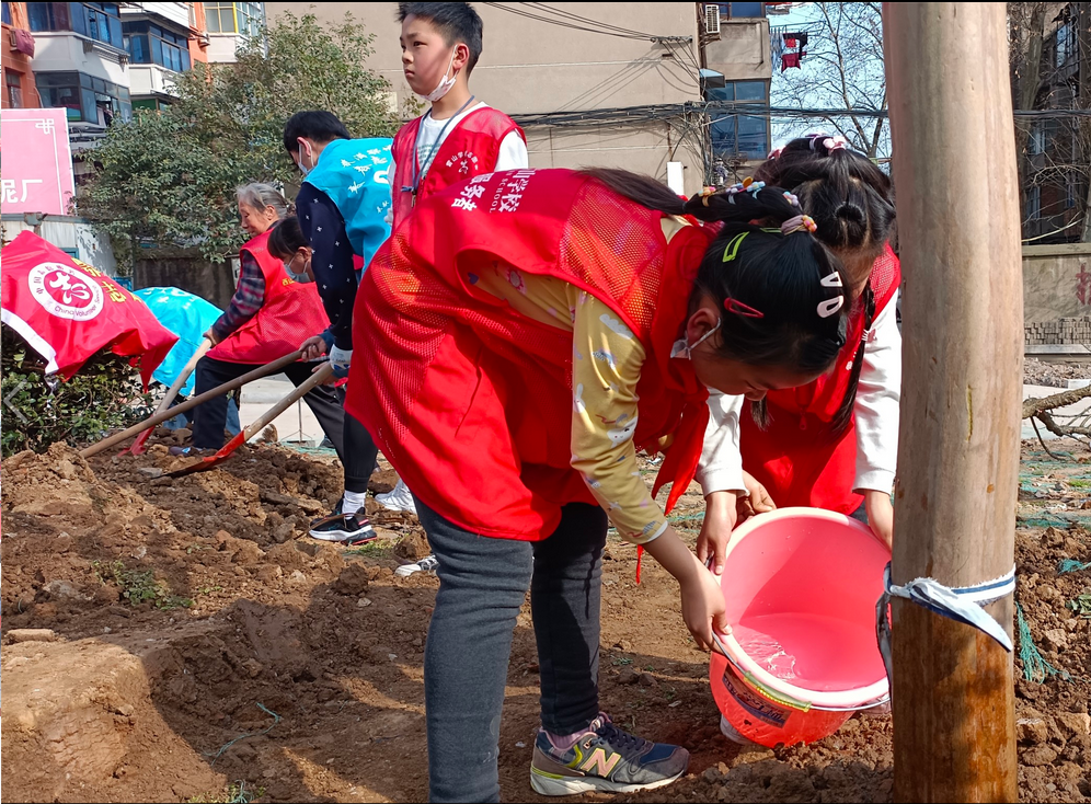 在植树过程中,由于树木较大,社区安排挖掘机挖坑、栽树,志愿者们培土、浇水,每一道工序都忙而不乱,大家同心协助、积极参与、干劲十足;孩子们热情投入,有的扶正树苗,有的培土夯实,鞋子沾满泥土,额头淌着汗水,现场一片热闹的景象。通过一番劳动,刚刚栽好的树木在春风中迎风挺立,新冒出的枝芽格外清新,为大地增添了勃勃生机。
