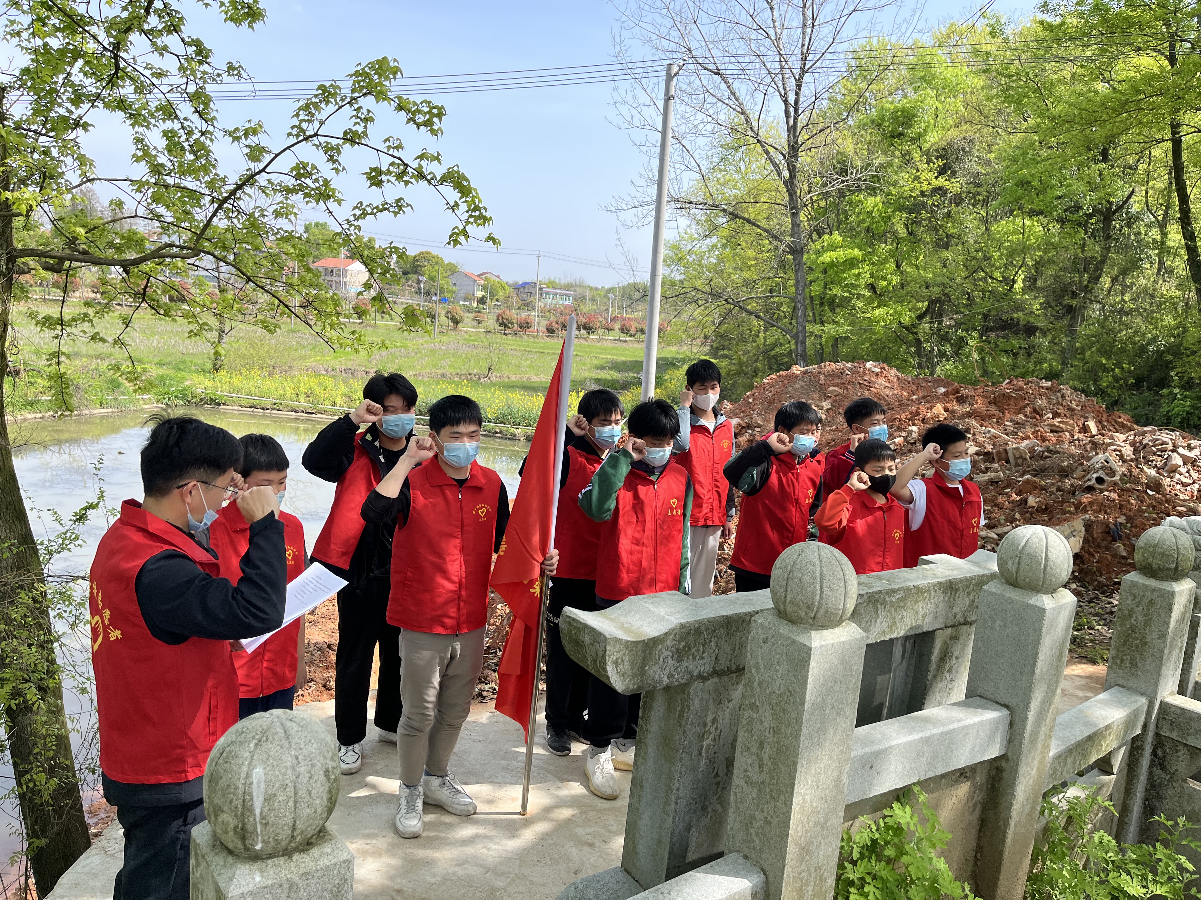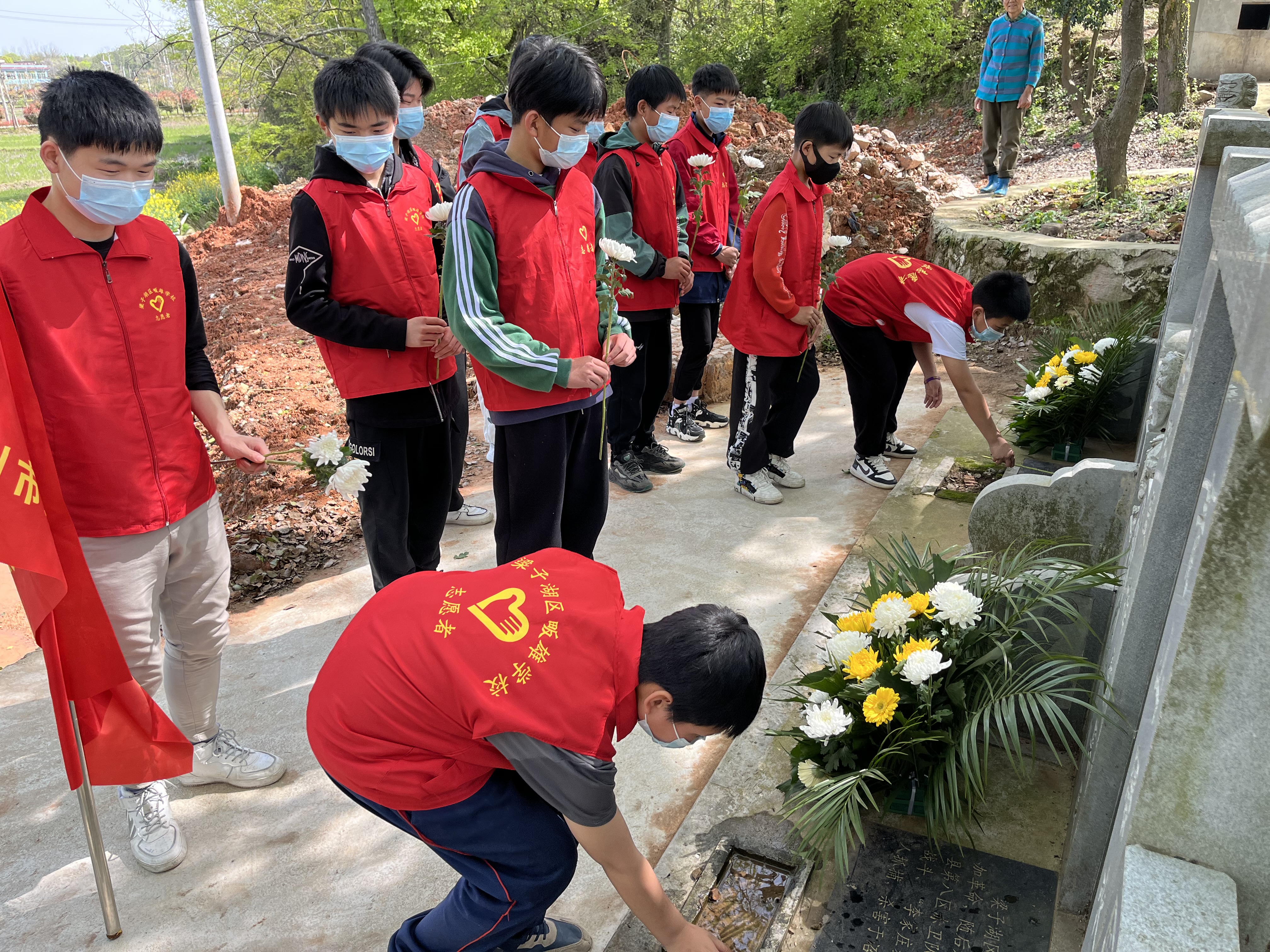 到达现场,鲜红的队旗在春风中飘扬,学生们开始对烈士墓前的树叶和泥土进行清理。紧接着在庄严肃穆的革命烈士墓前,学生们默哀致敬、敬献鲜花并重温入团誓词,来表达对先烈的敬意。