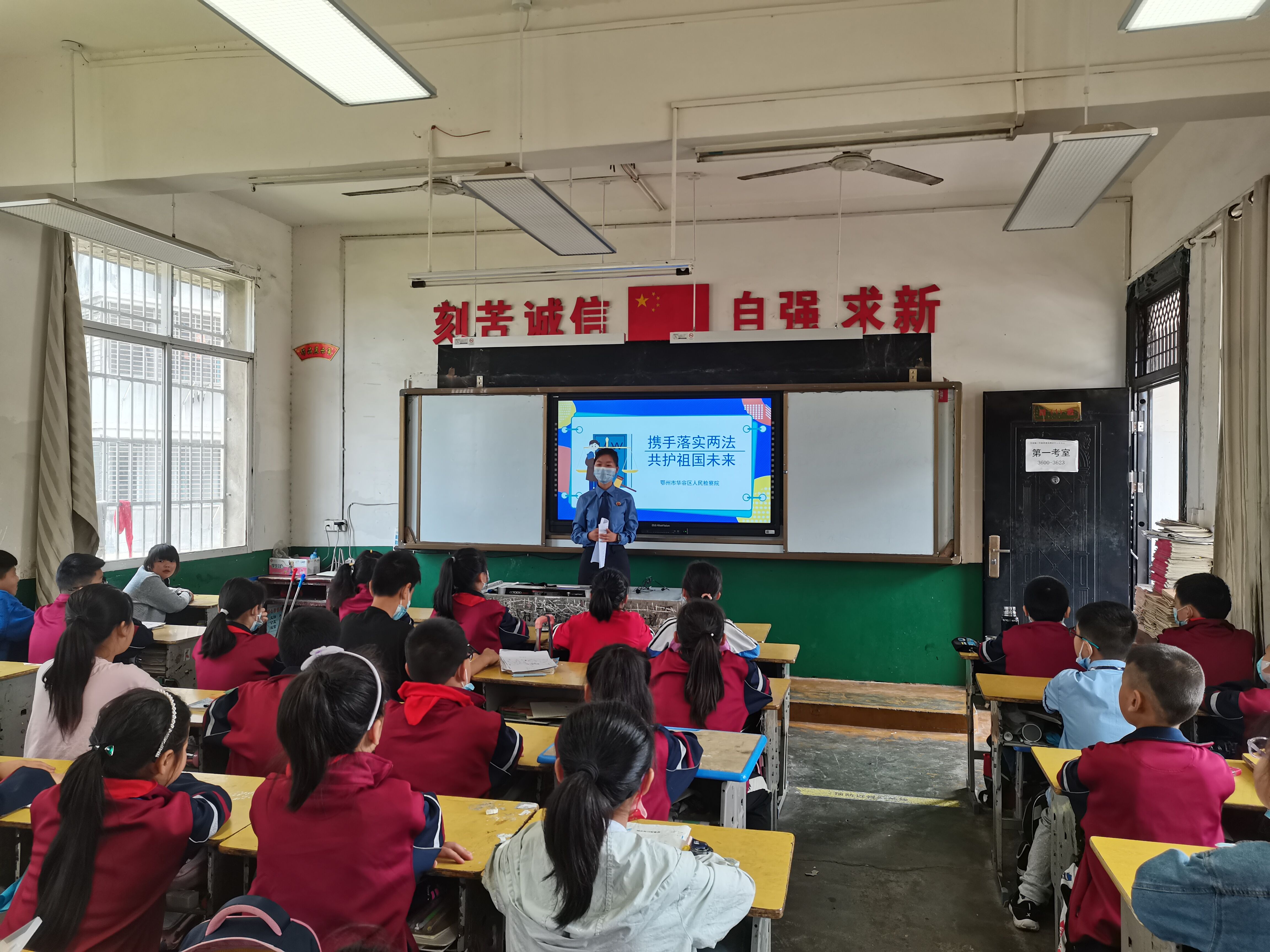 5月23日上午,凉亭小学邀请华容区检察院王思杰法官为全校师生带来一场别开生面的法制课。王思杰法官以“携手落实两法,共护祖国未来”为题,主要讲解《未成年人保护法》和《预防未成年人犯罪法》,采取“面对面授课+提问”方式,紧密联系生活实际,结合一个个发生在学生身边的典型案例,用通俗易懂的语言,深刻剖析青少年违法犯罪的原因,重点普及预防校园欺凌、拒绝毒品、防溺水、防电信诈骗、交通安全、消防安全等方面的知识,讲授了自我防范的措施和方法,教育学生做到知法、懂法、守法,不断增强法治观念。最后,王思杰法官进行有奖问答。