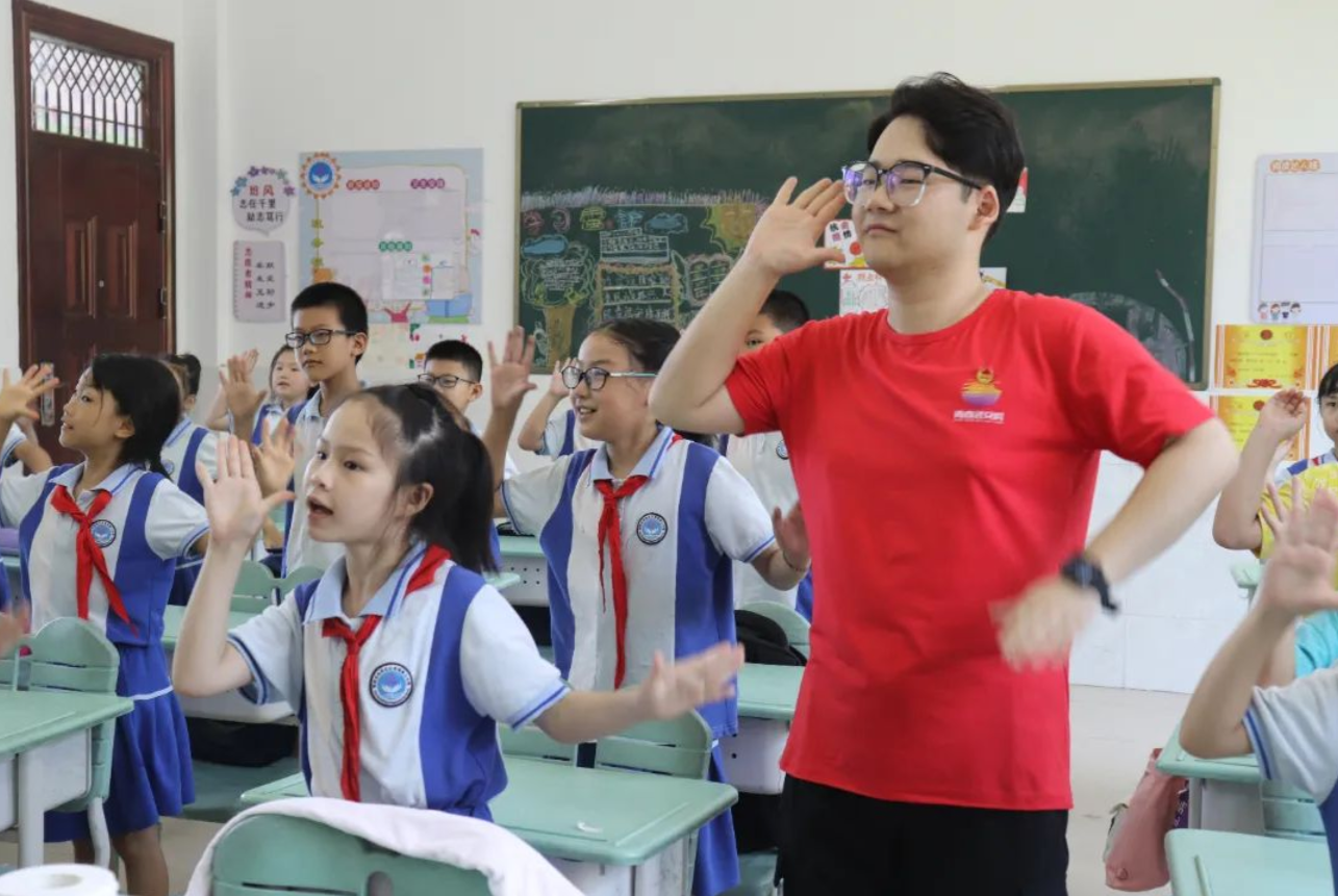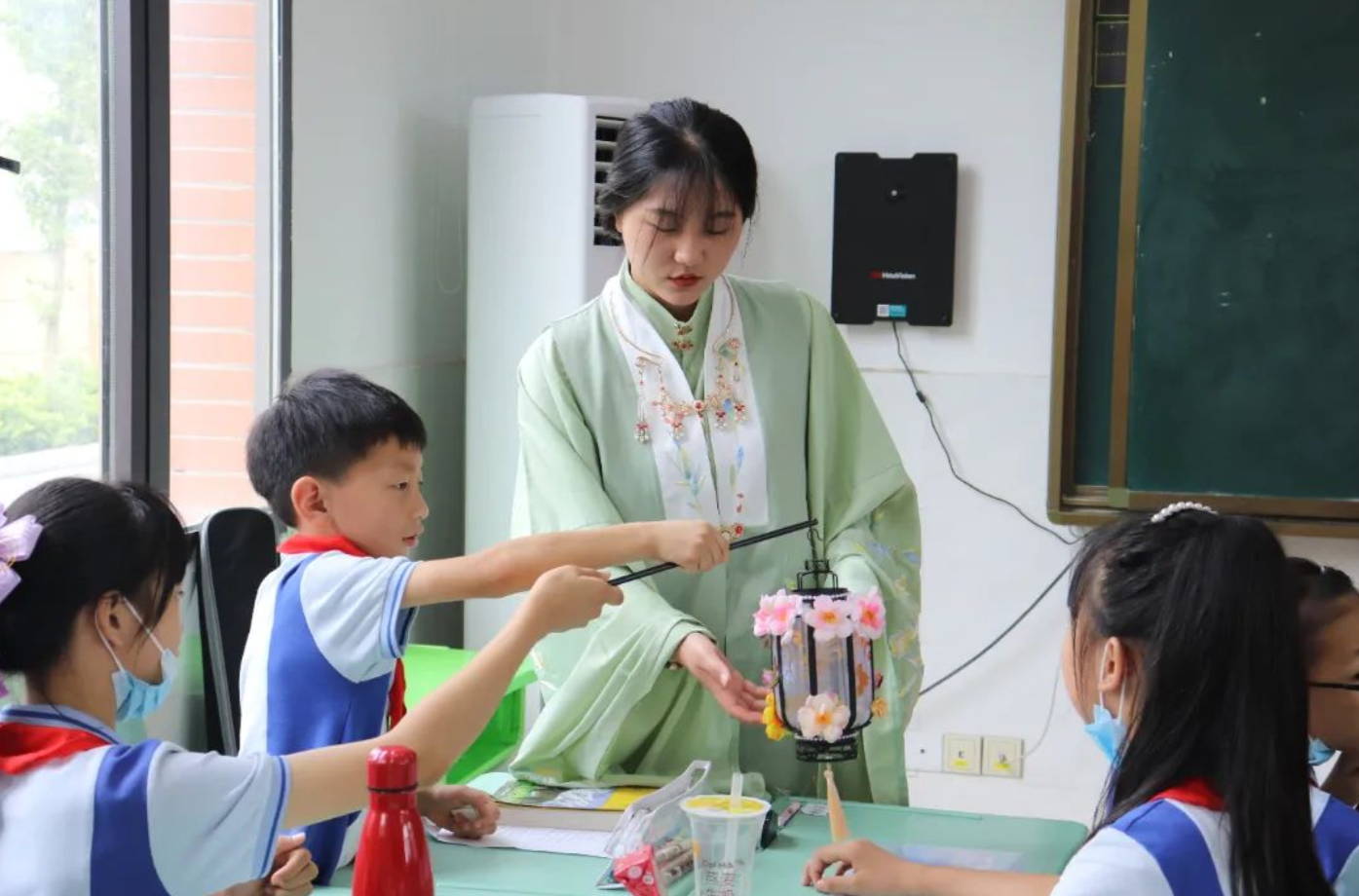 “哇!小妍老师好漂亮!”7月11日,在孩子们的惊呼声中,志愿者们身着汉服、正衣冠走进红莲湖第三小学教室,为小朋友们开展了一次传统文化宣讲活动。志愿者们讲述了中国古代的劳动起源和风俗,并介绍了传统农耕工具、二十四节气等跟劳动相关的传统文化。小朋友们连连感叹中国传统文化博大精深,何志远同学在班上情不自禁地读起了传统农耕诗。课后,志愿者们邀请小朋友们一同体验汉服之美,校园里传来阵阵笑声。