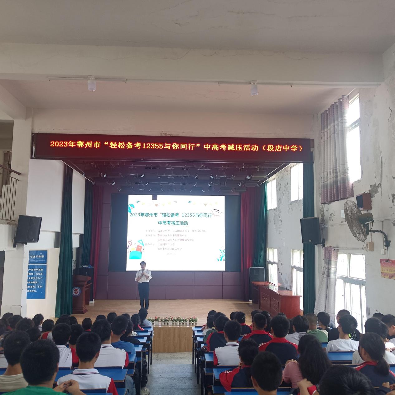 市未成年人心理健康辅导中心胡丹老师走进鄂州市华容区段店中学,以《阳光“心”行动 健康向未来》为题,从九年级学子学习生活现象及心理状况入手,深入浅出地讲述焦虑的表现、焦虑程度与学习效果的关系、焦虑产生的原因和焦虑的预防等四个方面的相关心理知识,结合实际问题提供了具体缓解焦虑和调节情绪的方法,并以有趣的减压小游戏互动环节让同学们轻松融入到整场减压活动之中。