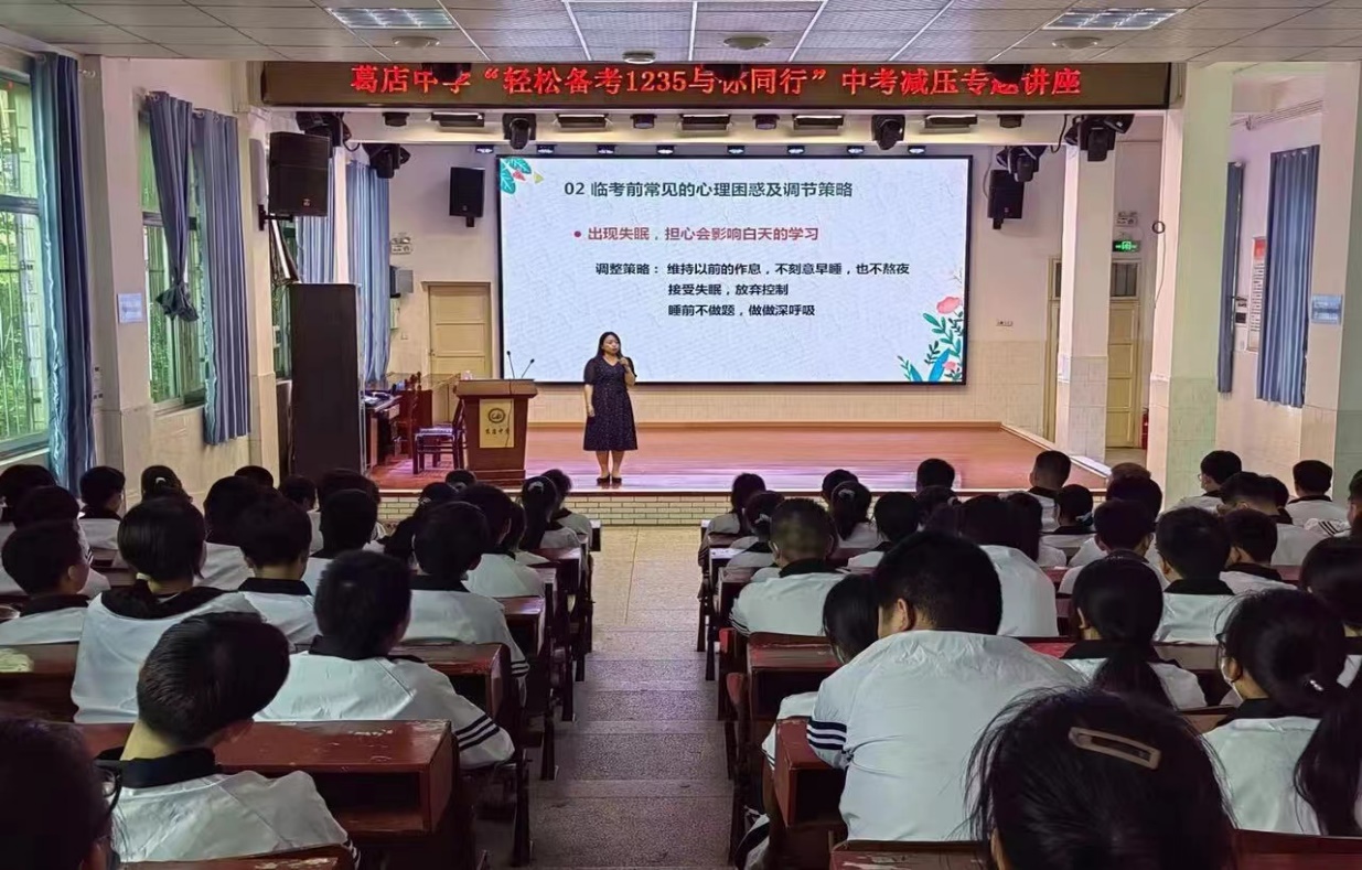 5月31日,葛店中学组织全校初三近150名学生参加中高考心理减压活动,市未成年人心理健康辅导中心资深心理咨询师尹莉娜老师通过专业的讲解,将实际案例和有趣的互动融入其中,并具体讲解调整认知状态、增强自信心、积极自我暗示等科学减压方法。现场气氛活跃,欢声笑语中,同学们表示要学以正确看待和处理考前的心理焦虑问题,以自信、乐观、健康向上的心态迎接中考的到来。