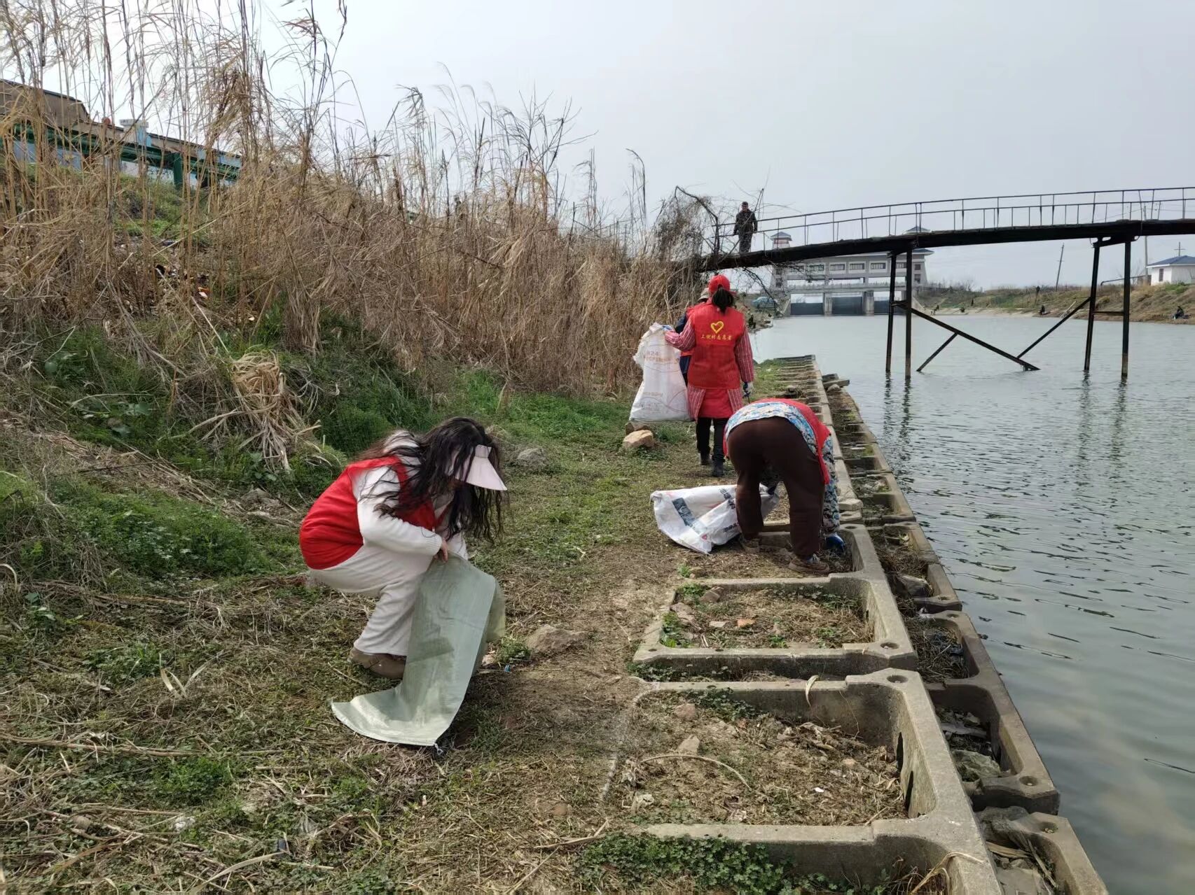 现场志愿者们统一身着志愿服、头戴小红帽,分工明确、干劲十足。南岸清洁由乡直机关各类志愿者及小庙村志愿服务队负责,北岸清洁则由上倪村、石竹村、大庙村志愿服务队协同开展,大家手持夹子、垃圾袋、捞网、镰刀等工具,仔细清理岸线的白色垃圾、枯枝杂草和废弃杂物,不放过任何一处卫生死角;保洁公司专业人员则专注于港内垃圾、水草的打捞作业,全力清理水域漂浮物,让薛家沟青奉寺段的岸线和水域环境得到切实改善。