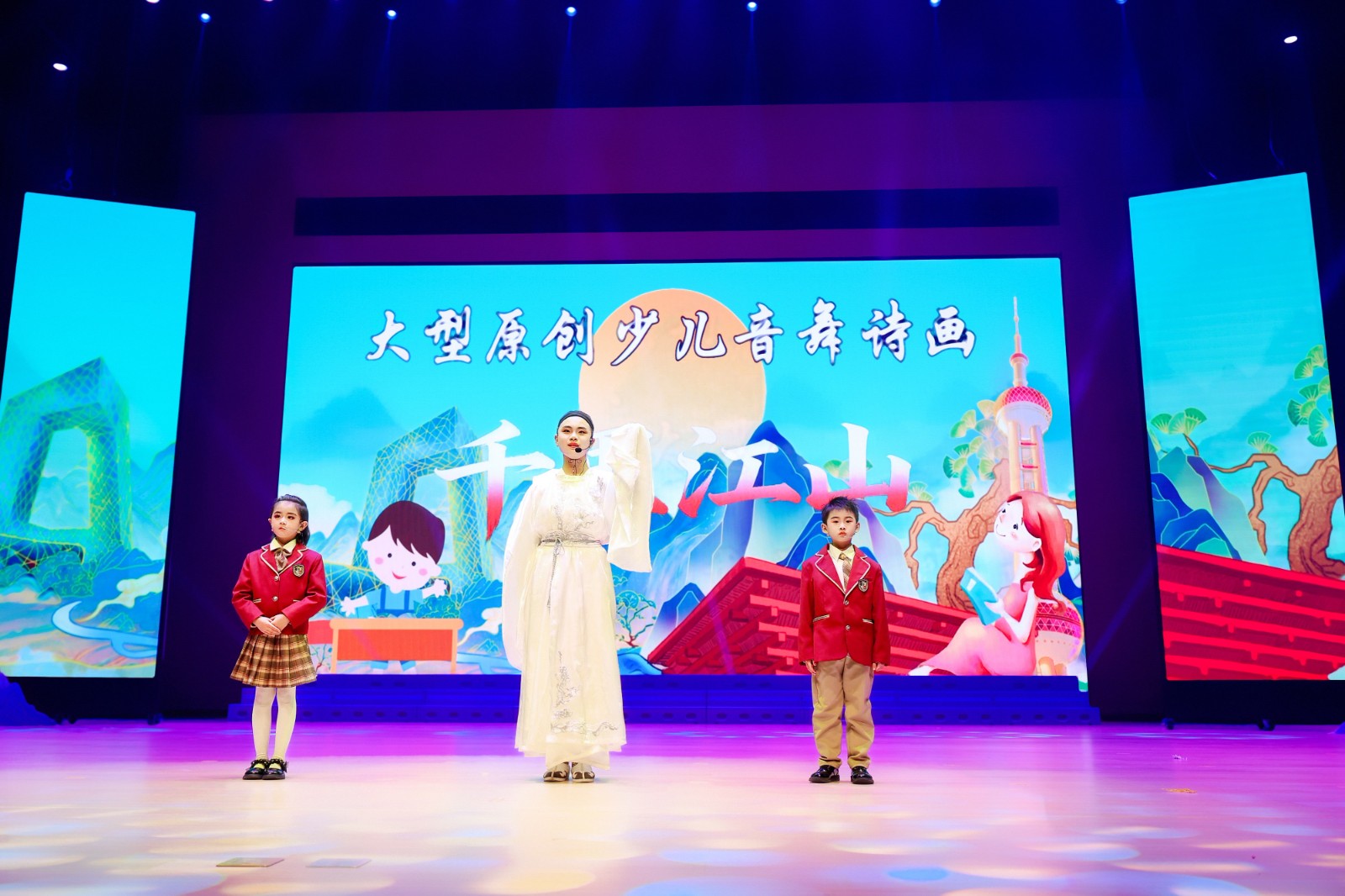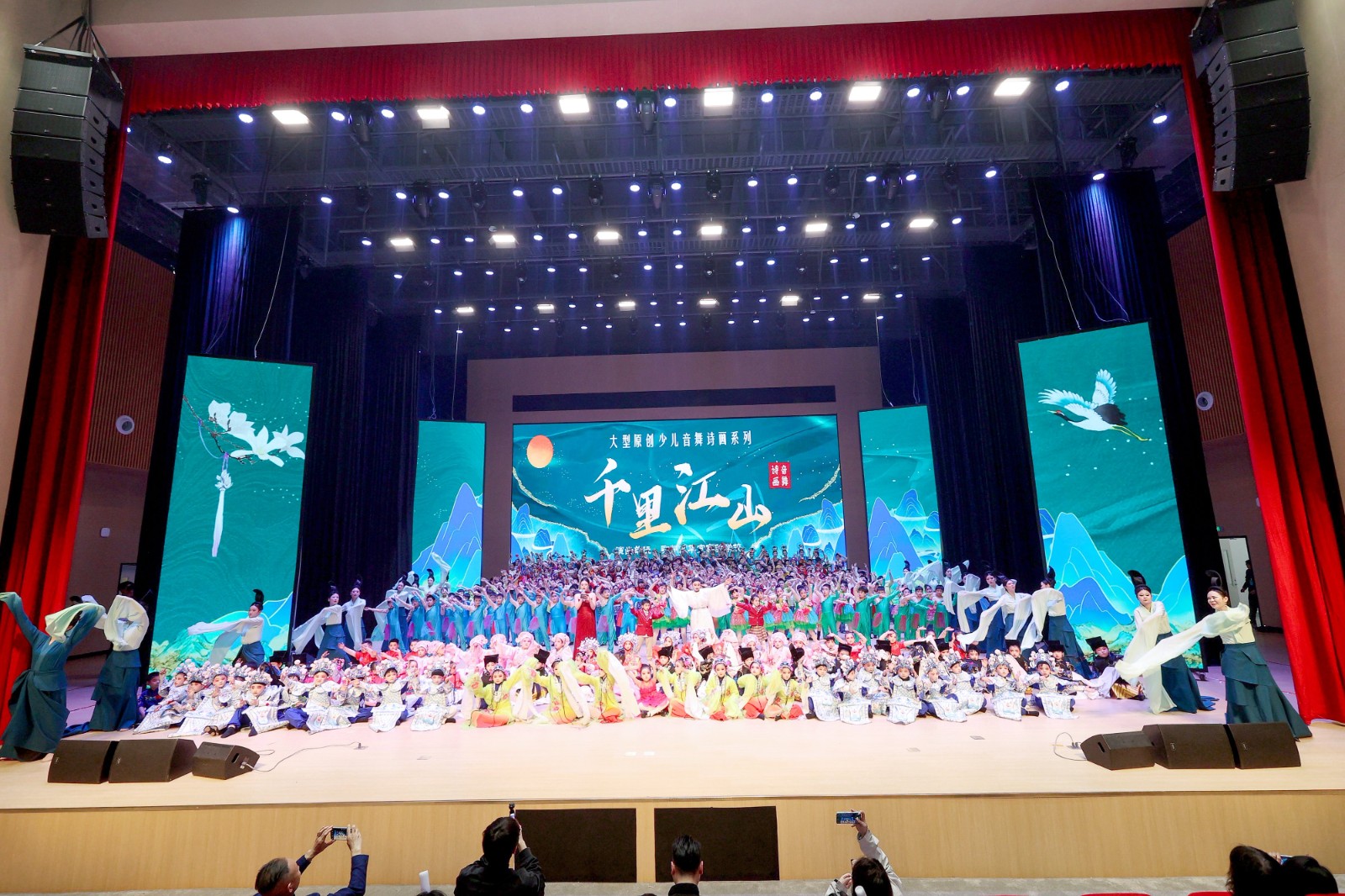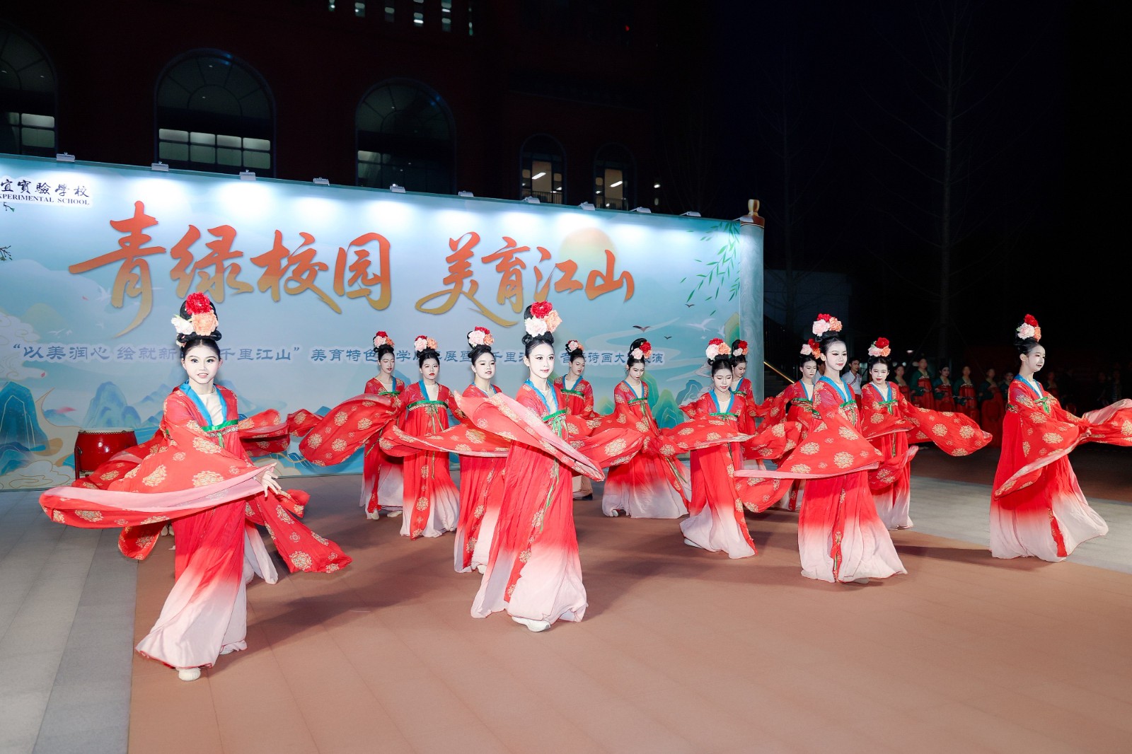 整场剧目以北宋传世名画《千里江山图》为艺术蓝本,以“入画、启卷、诵卷、抚卷、阅卷、呈卷”六大篇章为脉络,讲述该校学生穿越千年与北宋画家王希孟相遇的文明之旅。教师舞蹈《只此青绿》优雅开篇,《千年呼唤》《水墨江山》《风华绝代》展现中华优秀传统文化底蕴,《丰收田野》《建设之歌》彰显时代精神,《浪漫航天》《士兵突击》《科技之光》传递家国情怀与创新追求,《绿水青山》《大写中国》《共筑中国梦》《人民就是江山》抒发孩子们爱国赤子之心。